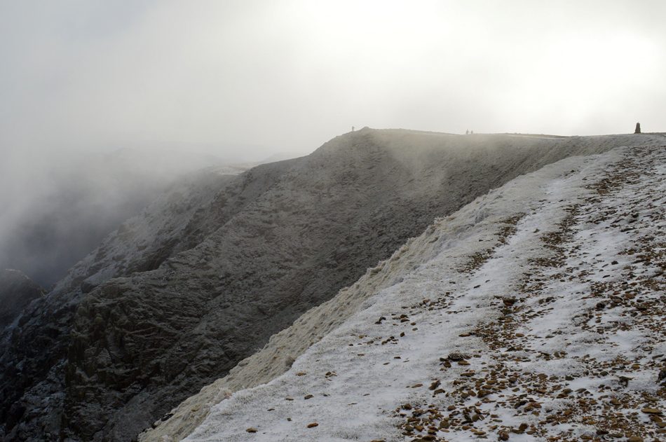 We were in two minds whether we should take a wander over to the top of Striding Edge mainly because the cloud was still drifting over the top of the summit but we thought "sod it" lets just go anyway soon passing the summit cross shelter which was deserted before passing the two walkers we had seen on Striding Edge earlier, both of which weren't entirely dressed for the occasion wearing jeans and duffle coats. Everything kinda makes sense now...