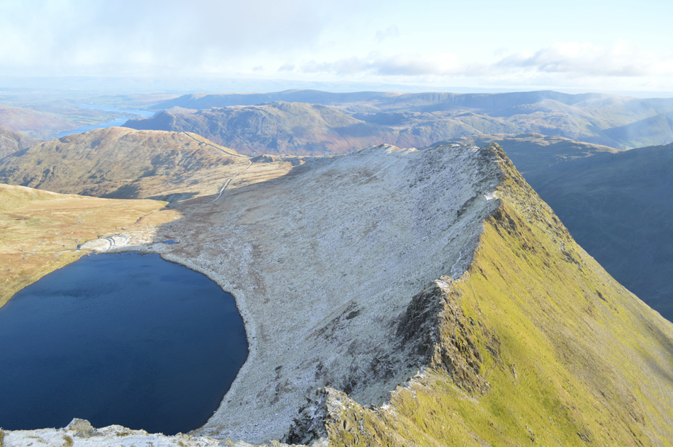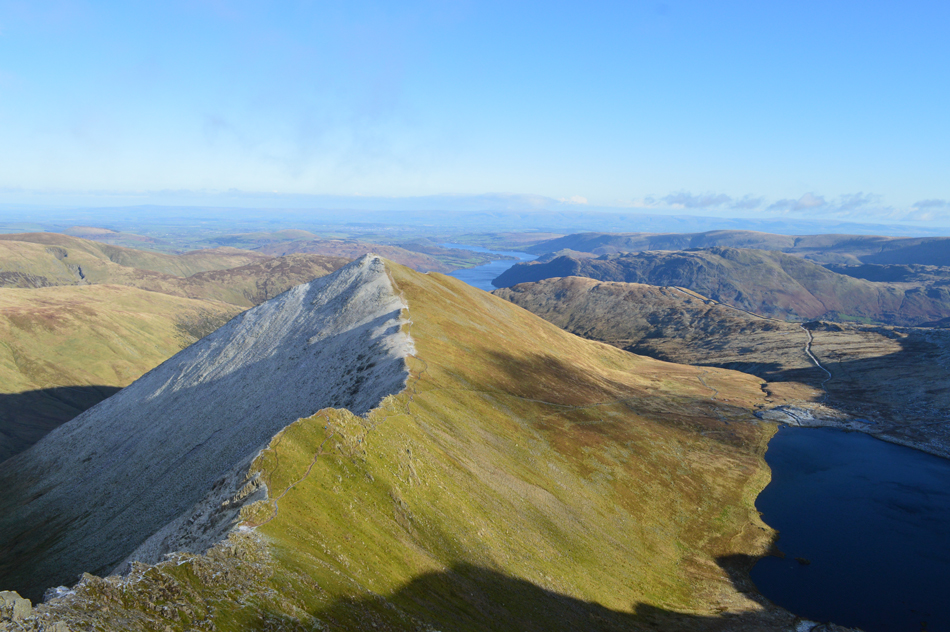 Looking down on Striding Edge, Red Tarn and Birkhouse Moor from the Gough Memorial. |