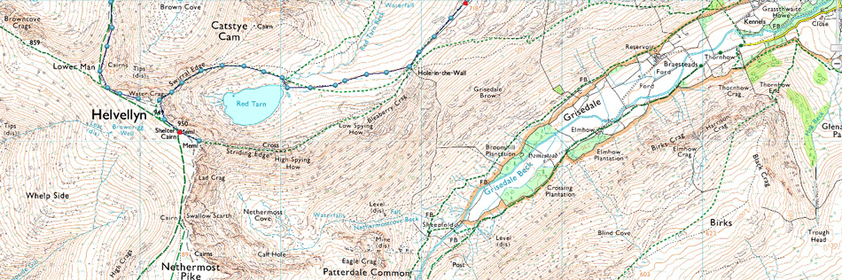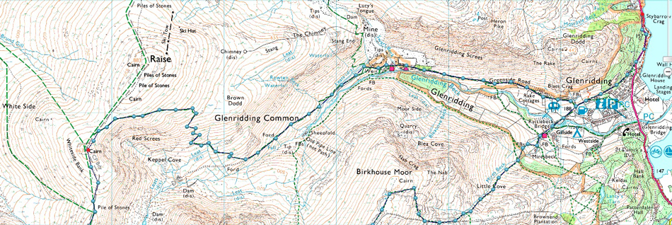 Stybarrow Crag - Glenridding - Mires Beck - Birkhouse Moor - Hole-in-the-Wall - Red Tarn - Swirral Edge - Helvellyn - Gough Memorial - Helvellyn Lower Man - White Side - Keppel Cove - YHA Helvellyn - Greenside Road - Glenridding - Stybarrow Crag |
