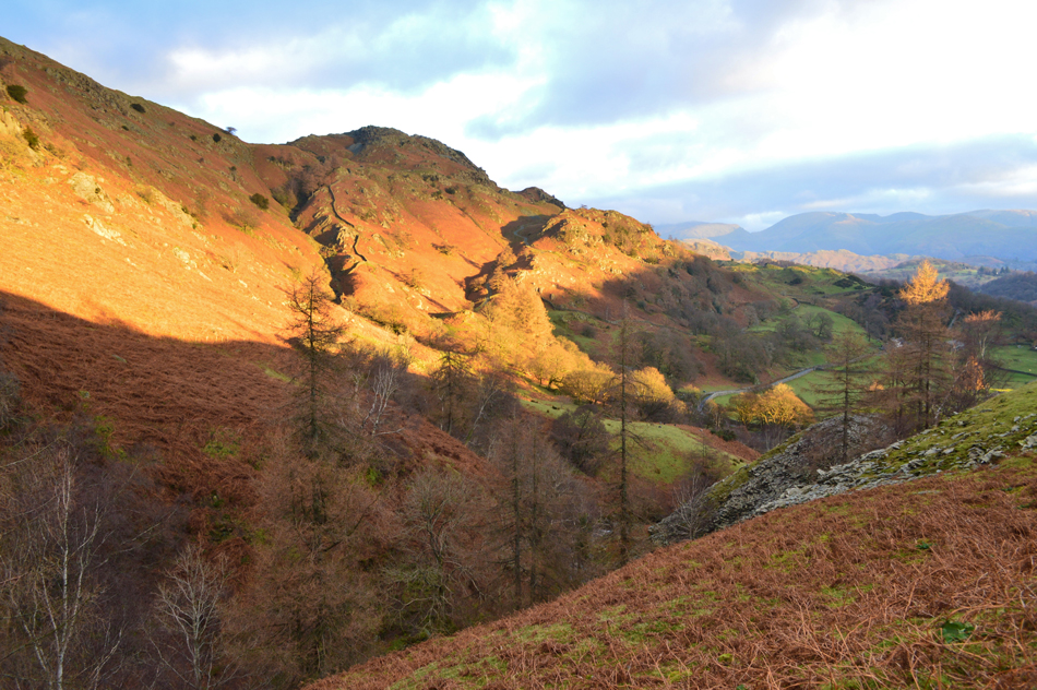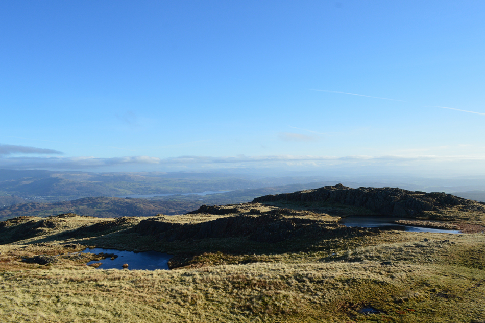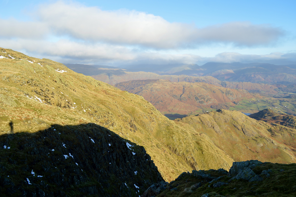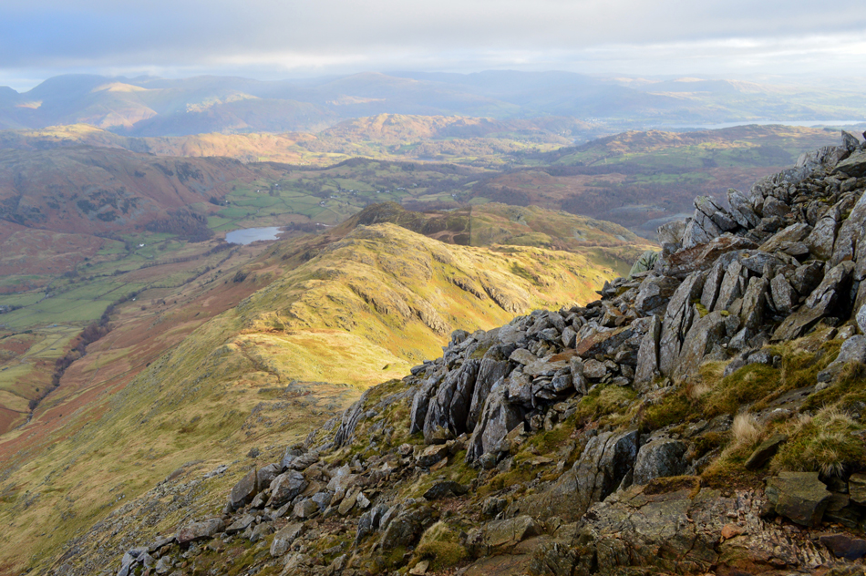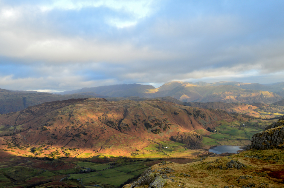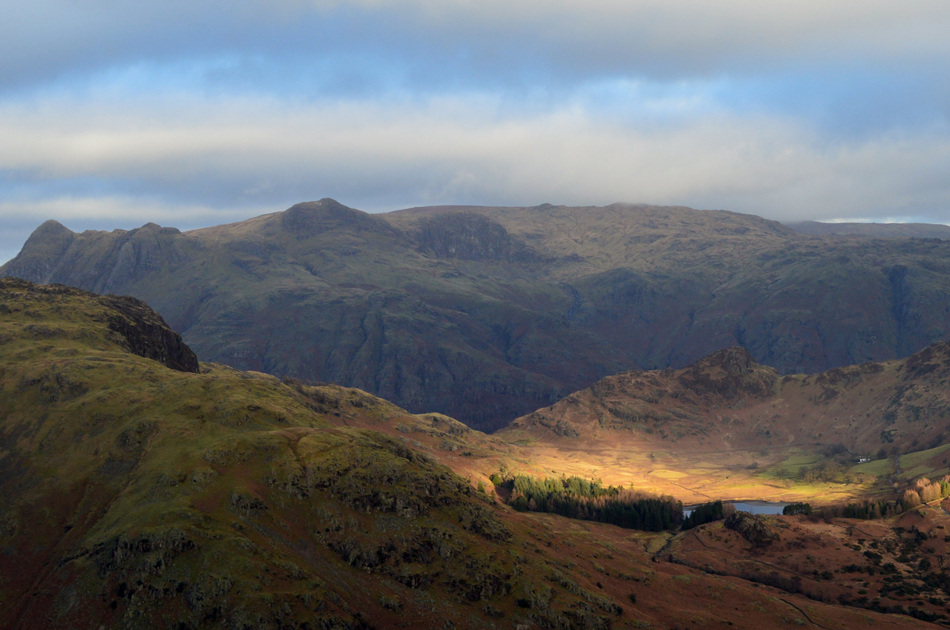 Distant Langdale Pikes with Blea Tarn and Side Pike over on the right enjoying a hint of sunshine. |