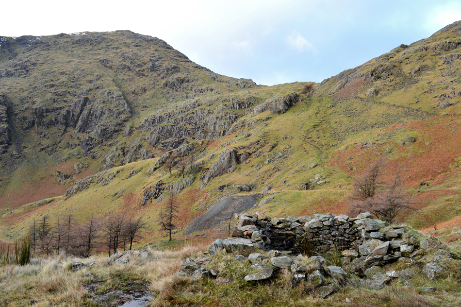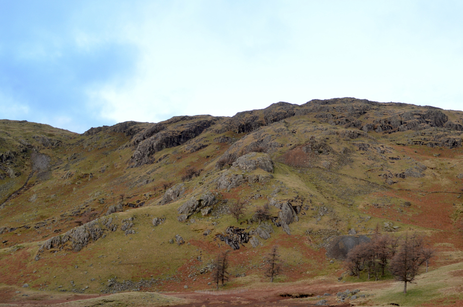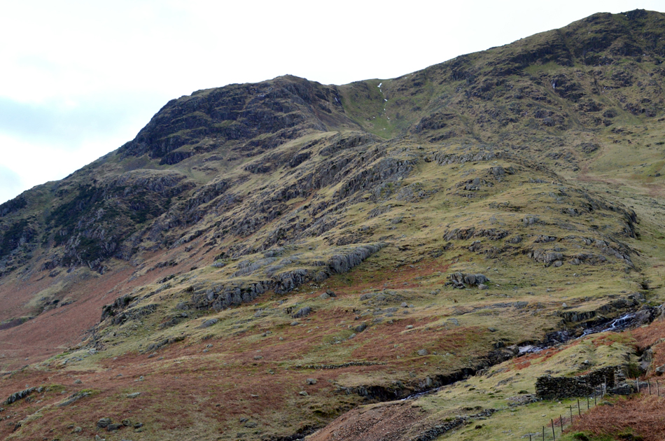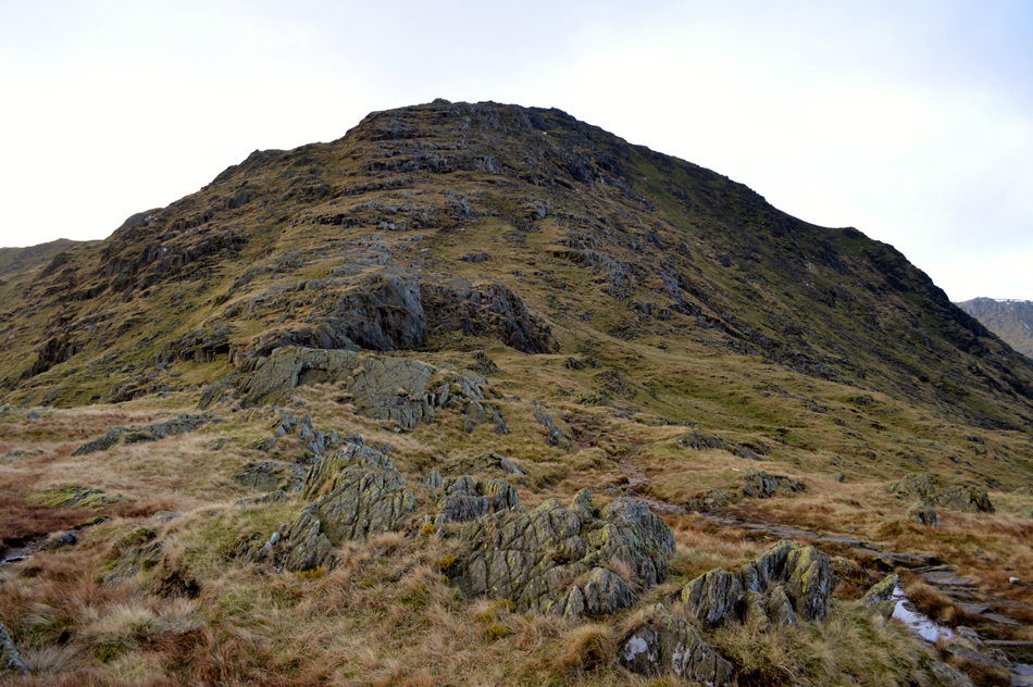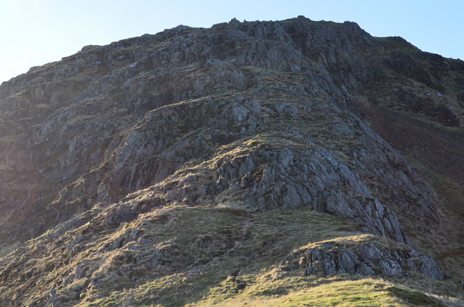 I've had it too easy up until now where the hard work now begins, here you can see the path more clearly in the centre right of the photo where it appears to take a direct route towards Birk Fell Hause but this isn't the case, instead the path veers right through the upper crags. |