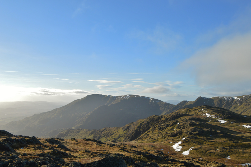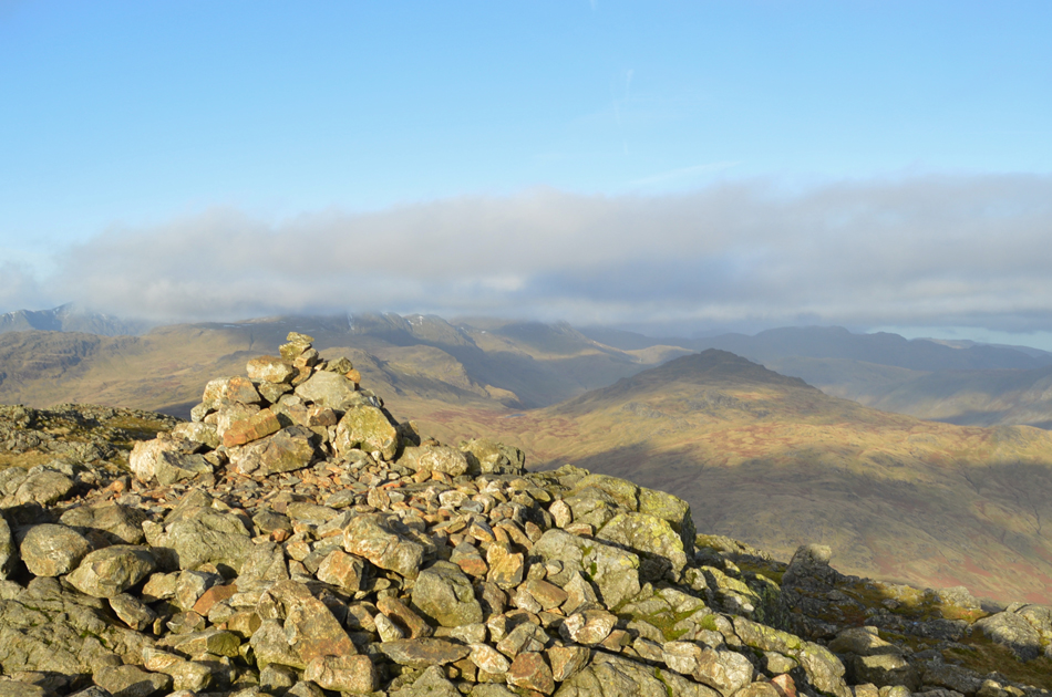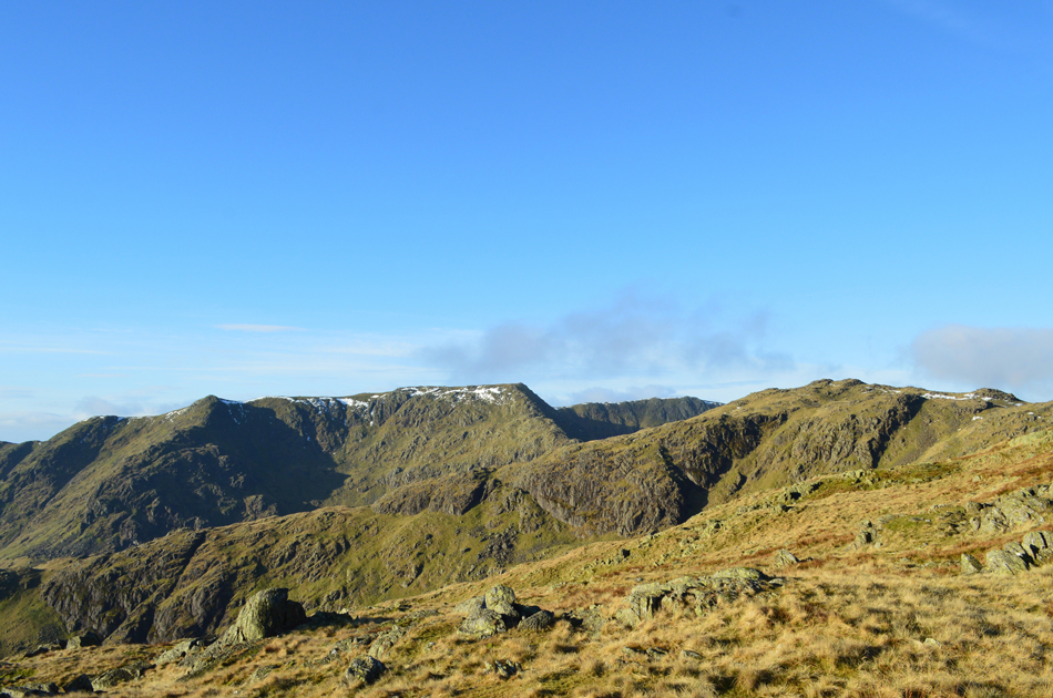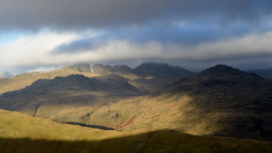 The view over the Black Sails ridge towards Great How Crags, Prison Band, Swirl How and Great Carrs. |