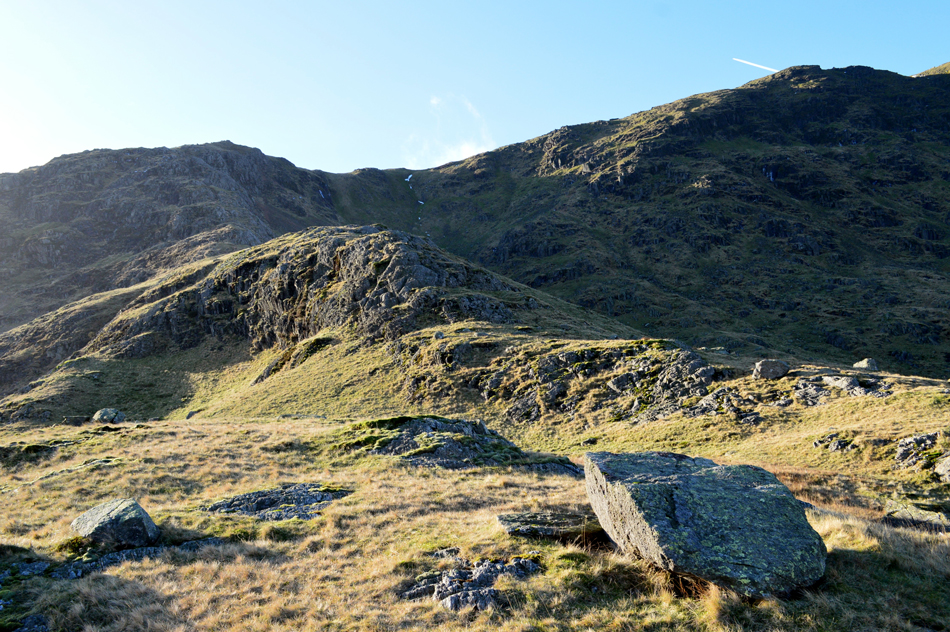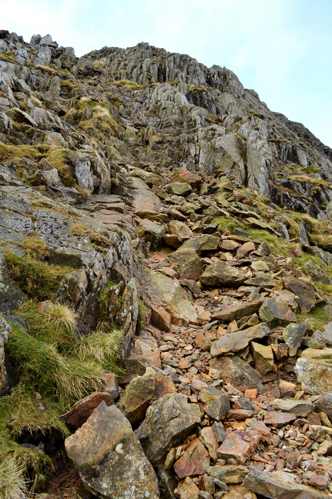 It's hard to describe this last bit of the ascent as a gully or a rake because there's no real feeling of enclosure. Care was taken mainly due to the loose boulders and rocks meaning it was always best to test footings first especially during the lower half of the ascent where the rock was loose and unstable. |