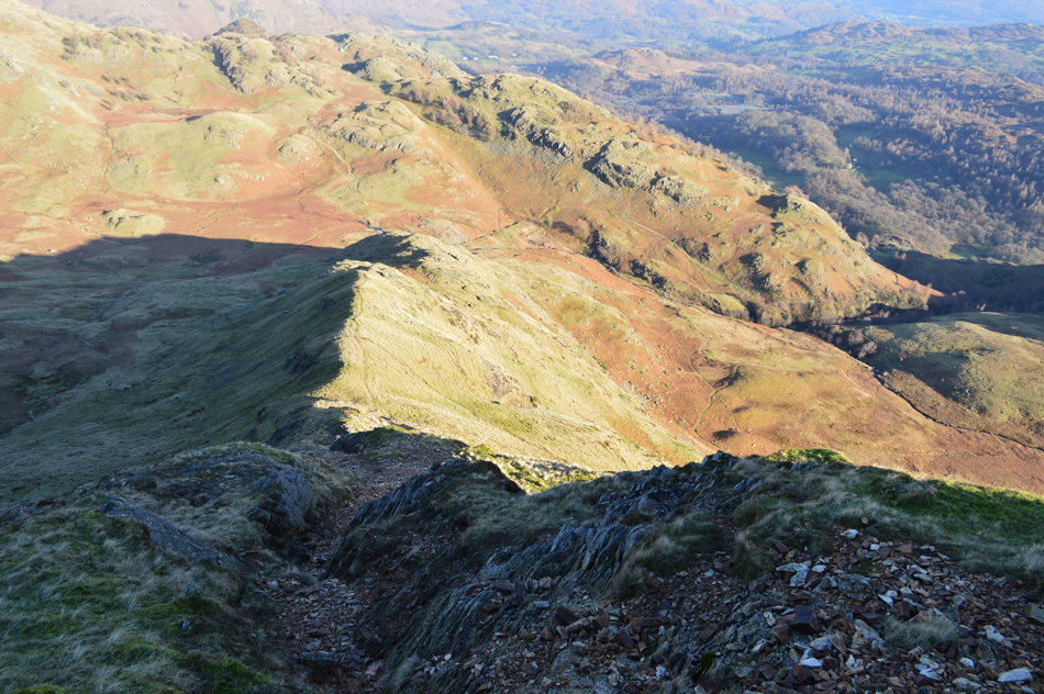 Wetherlam Edge, Birk Fell Man and Lingmoor Fell from the top of Hen Crag (gully) |