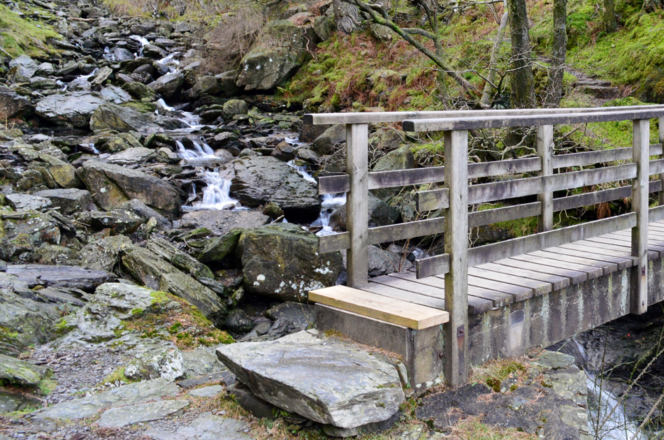 The path continues as my view opens out over the tree tops in Tilberthwaite Gill towards the mass of Wetherlam and Steel Edge, here the path forks left or right, heading left here navigates around the southern edge of the Gill while heading right descends into and then out of the Gill on its north side, I head right and begin the steep descent towards the footbridge over Yewdale Beck. The observant will notice the new wooden step on the footbridge! |