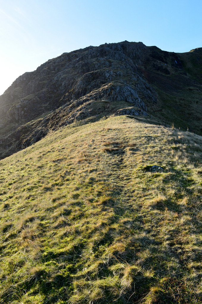 Steel Edge is starting to look more like a ridge now and from here I can get a good view of the ground conditions although to confirm this I'll have to be on the ridge itself. My main concern was of snow and ice and although I can confirm there appears to be no snow albeit a few patches, until I am on the ridge later I'll just have to keep my wits about me. |