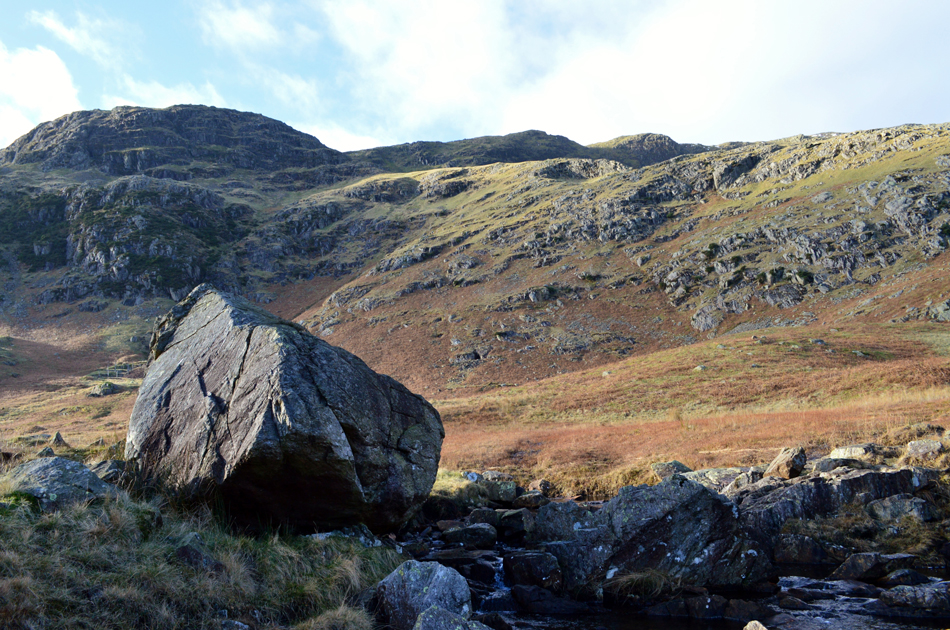 I pass an elderly gent wearing a pair of green tweed trousers tucked into a long pair of blue walking socks and we both mumble our 'mornings' as we pass by. On the opposite side of Tilberthwaite Gill two large groups make their way around Drybottom Cove just as I had this morning as I sit lent against a boulder eating my early lunch. The sun beams down low in the sky and I could easily take off half my kit and get away with walking back to the car with my sleeves rolled up but seeing as I'm so close to the car the faff is too much so I sweat it out instead.