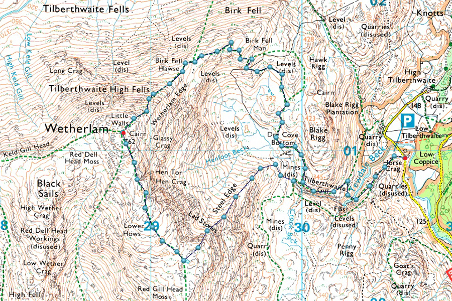 Tilberthwaite - Tilberthwaite Gill - Dry Cove Bottom - Birk Fell Man - Birk Fell Hause - Wetherlam Edge - Wetherlam - Steel Edge - Tilberthwaite Gill - Tilberthwaite |