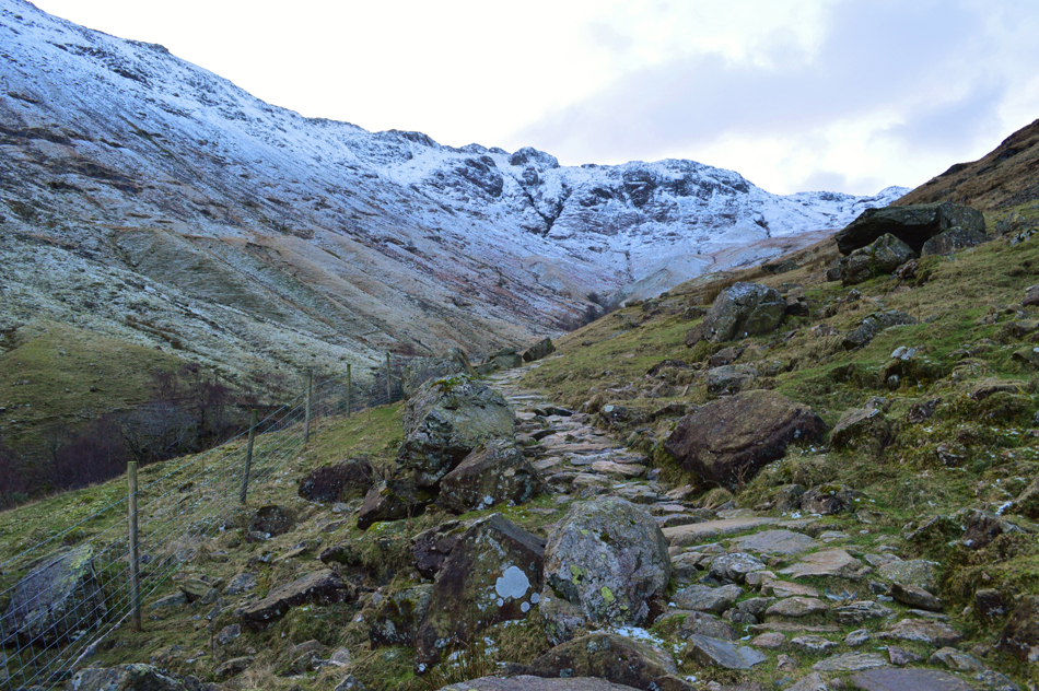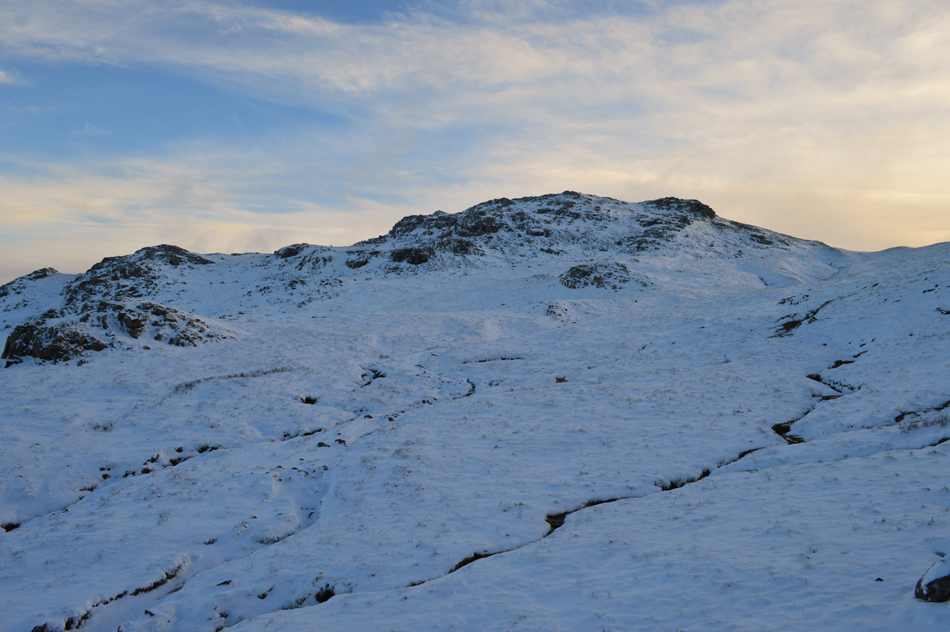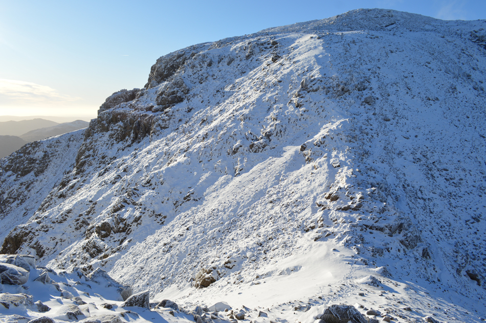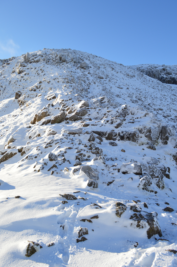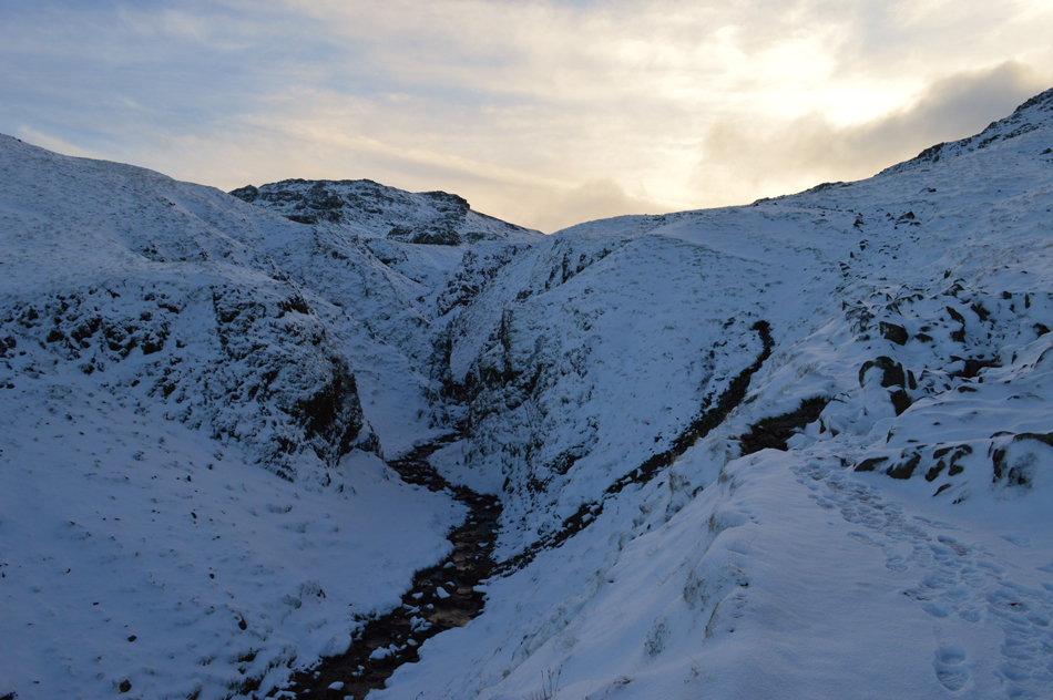 The path switches from right to left (during ascent) after crossing Grains Gill where care had to taken due to black ice forming on the footbridge which I only noticed at the last minute when light had caught the ice. With Grains Gill crossed I was now in the snow line at around 1,100ft. The snow was as expected light and powdery which thickened up to around 6-10 inches in places, my main concern was ice covered rock which was now covering sections of unavoidable path. |