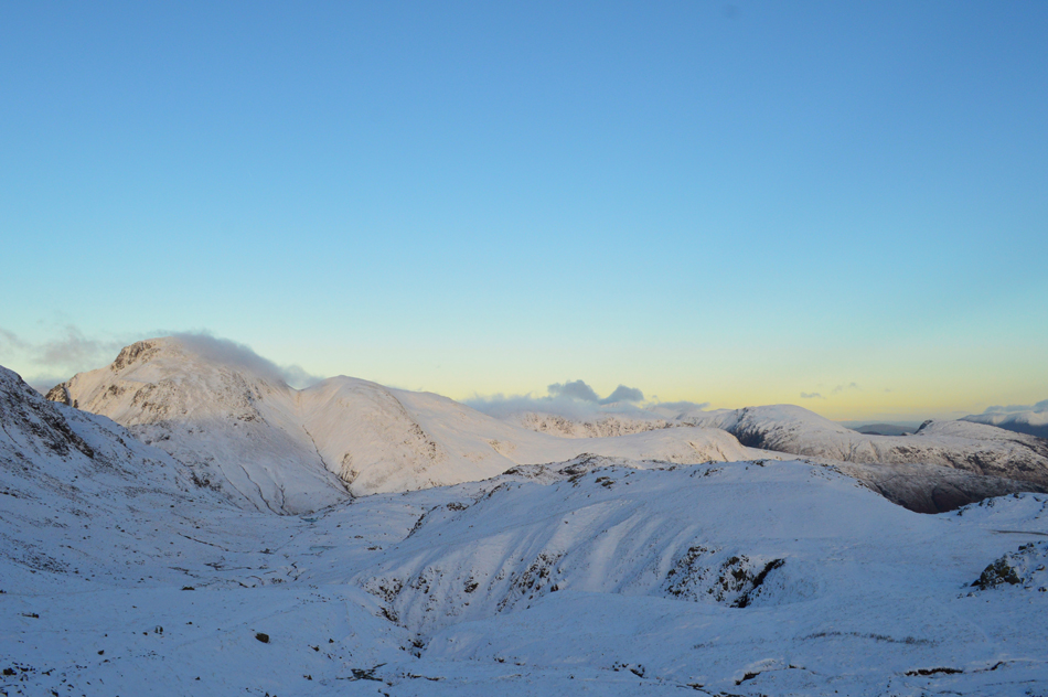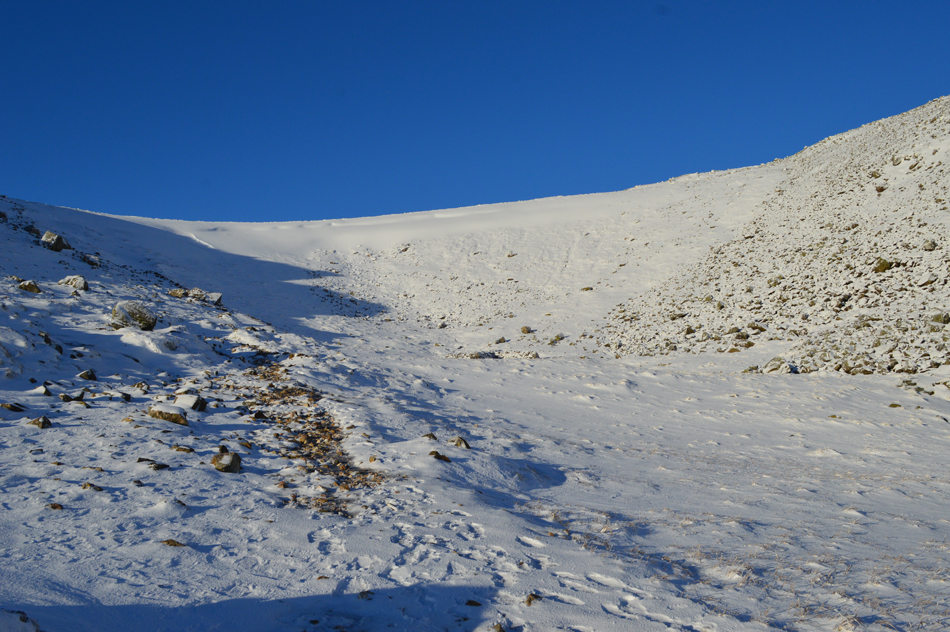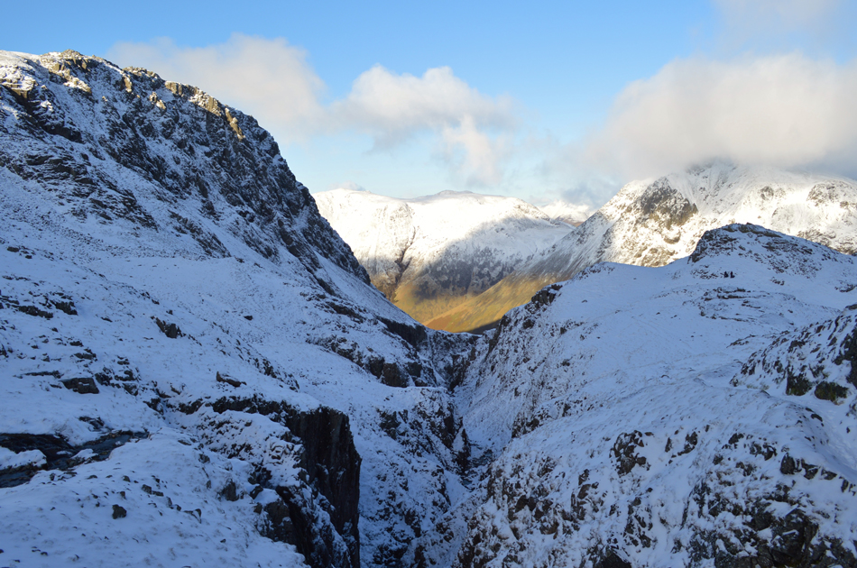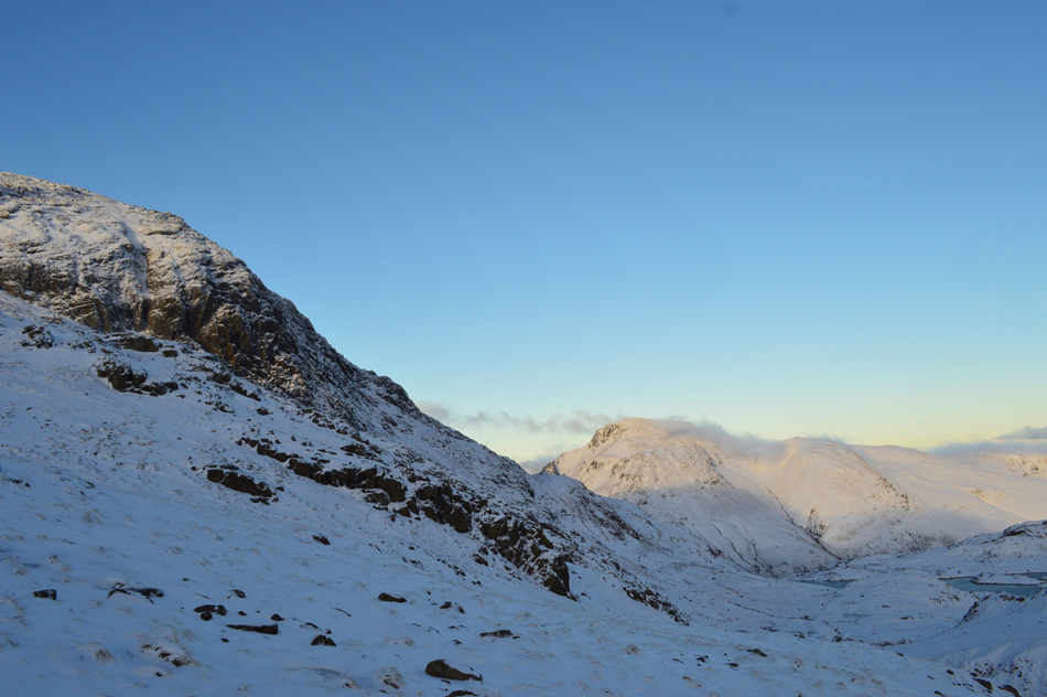 The snow remained soft underfoot only encountering sporadic ice which could have been avoided had I not have been wearing crampons. At this point I could have taken them off but with my return back to Styhead being via the Corridor Route and considering the lack of light/heat source the route receives at this time of year my perception is it's going to be quite icy which is why I'm deciding to keep the crampons on. |