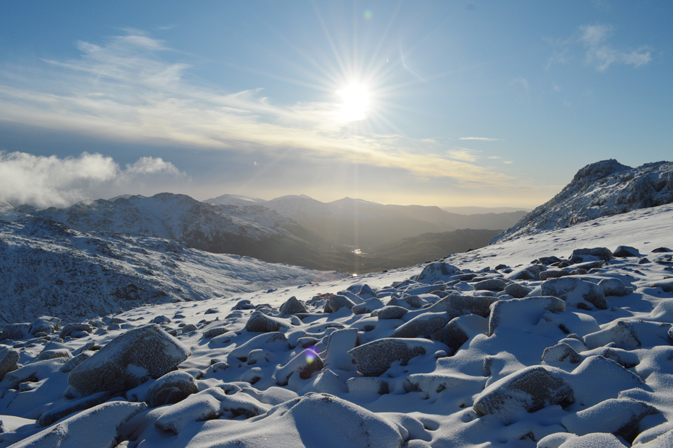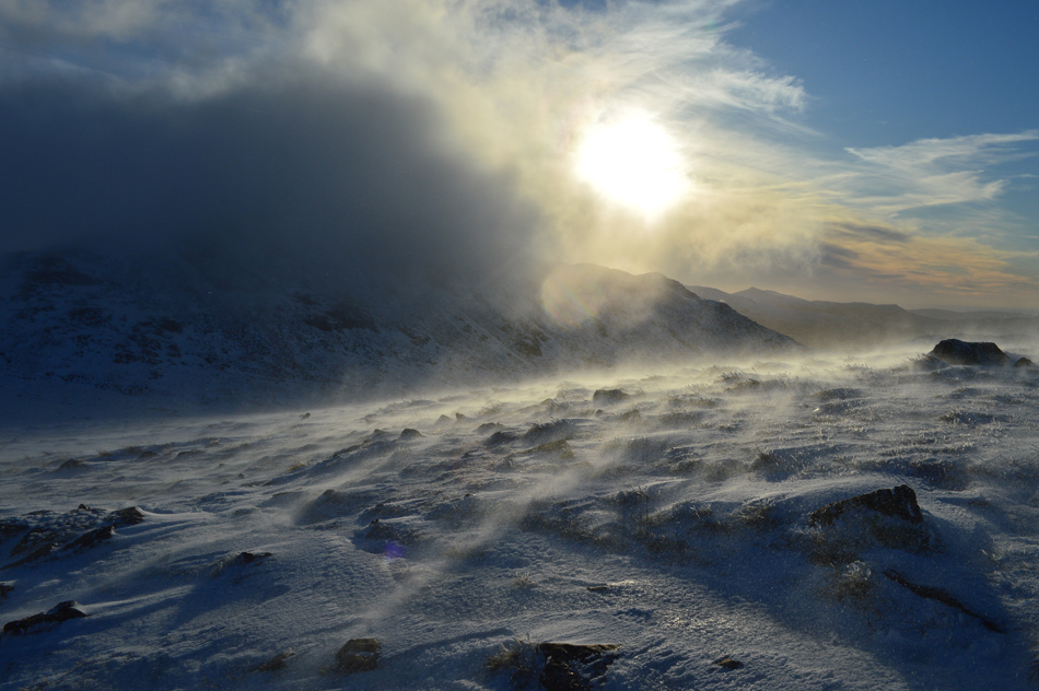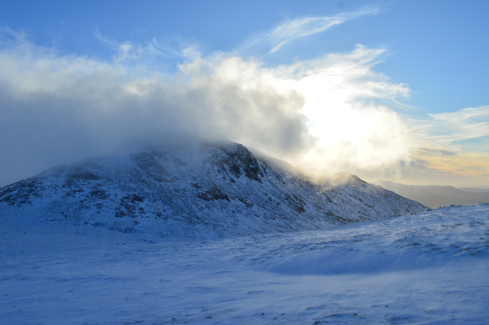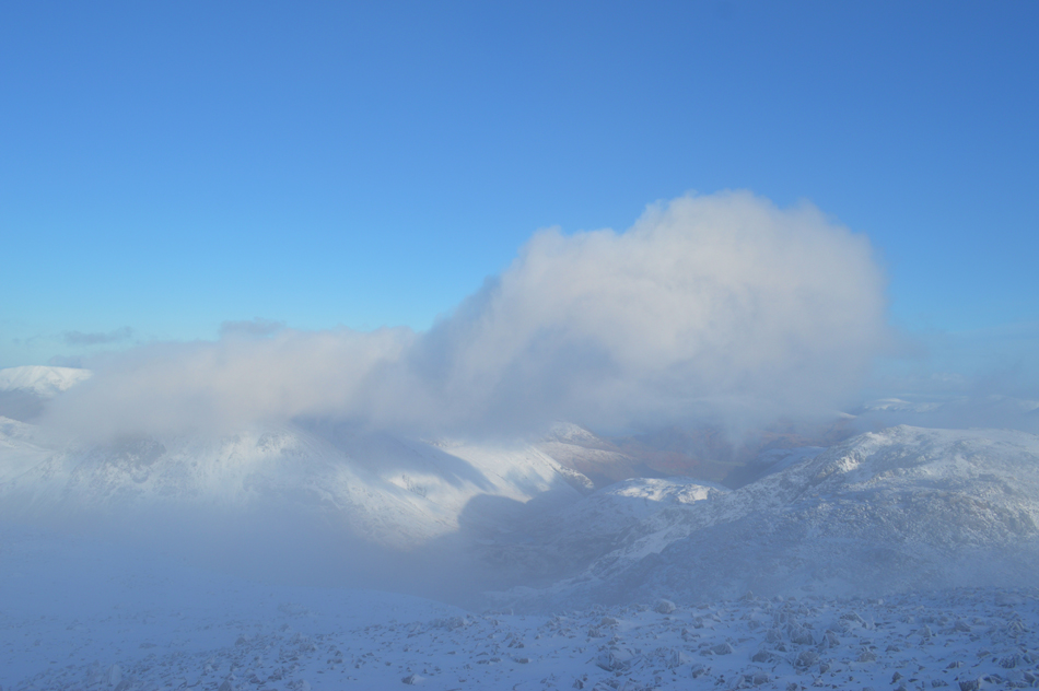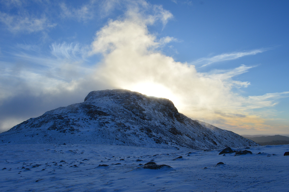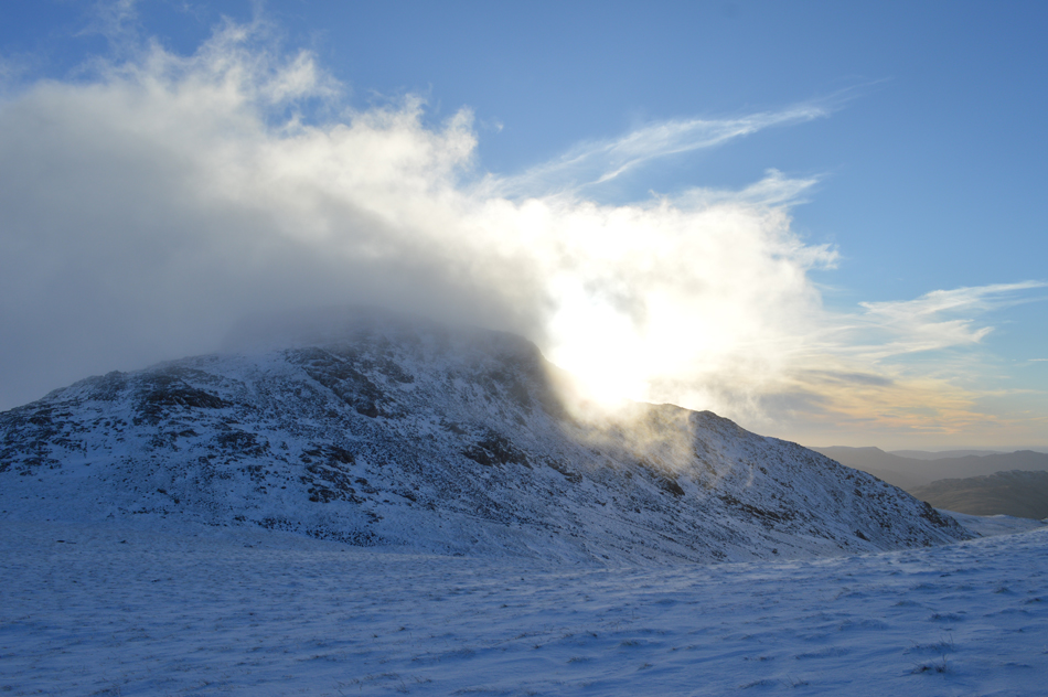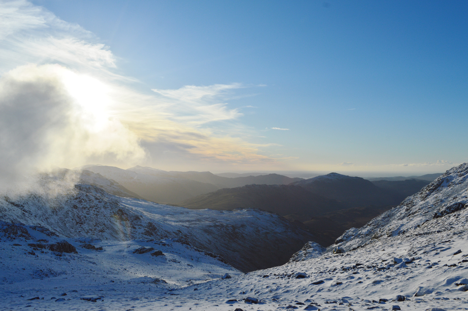 On reaching the top of Esk Hause I was greeted with not just immense windchill but a spectacular light show over Esk Pike caused by a low Winter sun and cloud which continually poured over the summit from the direction of the Langstrath valley. |