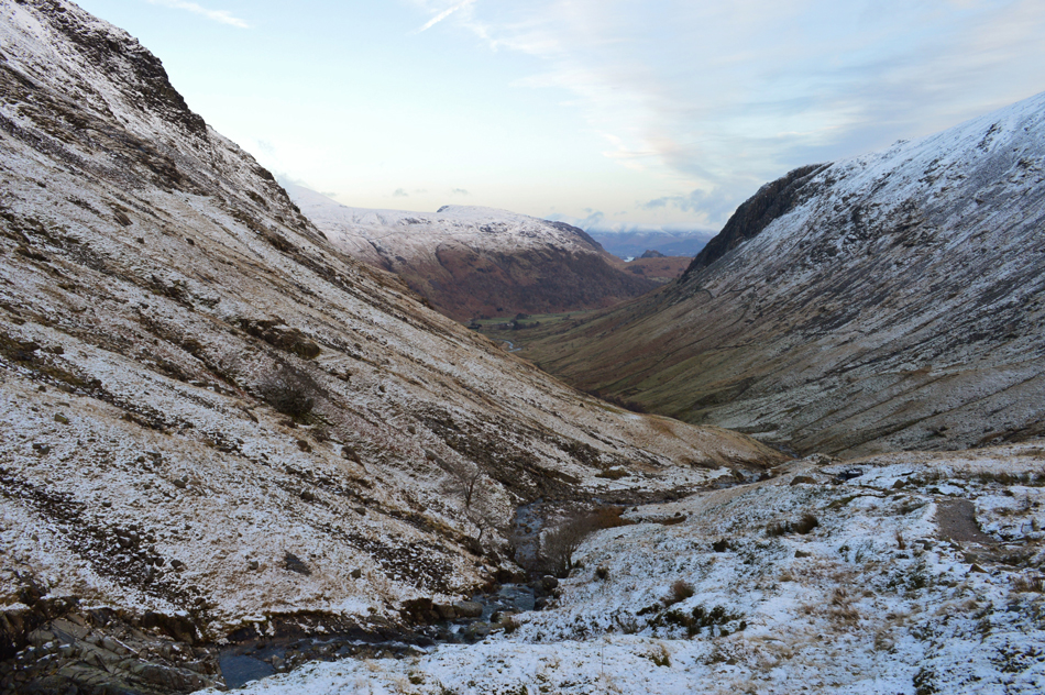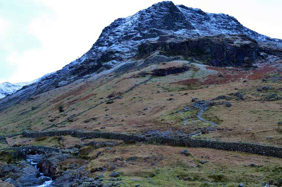 It was still dark during my drive through Borrowdale although by the time I reached the parking spaces close to the farm dawn was just starting to break, before I even had chance to park up three head torches were lit up alongside Sourmilk Gill no doubt on their way towards Gillercombe or Base Brown. With a strong forecast I wasn't surprised to find just a few spaces left and I parked my car next to a metal gate making sure enough space was left to manoeuver a tractor or quad bike, the car on the opposite side of the gate had done the same. It's -2°C but with little to no wind it feels milder, I kit up accordingly adding my new Mammut beanie which I kinda lost patience with into the walk but more on that later, my three year old Extremities gloves are also added which are now showing their age with most of the touch pads on each finger completely worn away but they still do the job of keeping the wind and damp out and that's good enough for me. |