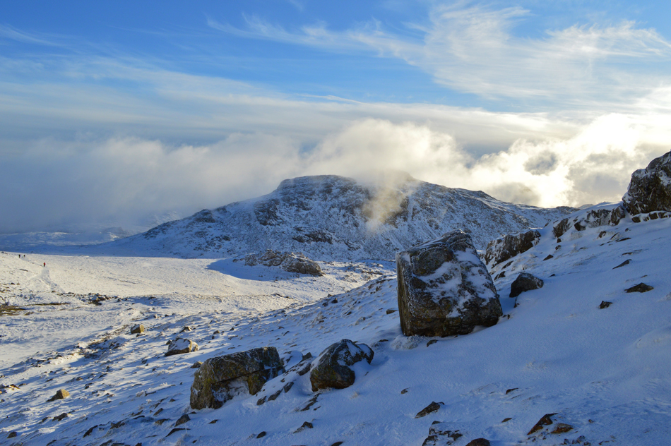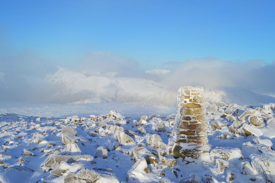 Upon reaching the shoulder of the summit I just knew that by the time I would reach the shelter I would be within the cloud, I could see it approaching and if anything it only added to the ambience of reaching Englands highest ground. At one point visibility dropped to around twenty feet and yet the sun still poked through the cloud like a giant torch only for the cloud to clear, then for it to return again. There was two guys already there which made a total of six at the summit, they spoke joyfully while the trio took shelter on the other side of the summit from the wind, one of the two guys held out a barometer gadget and I wondered over interested in its reading, it read -13°C windchill and it sure felt like it. |