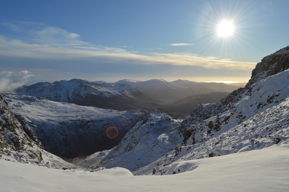 Sunshine over Great End with Round How below from the Corridor Route. |