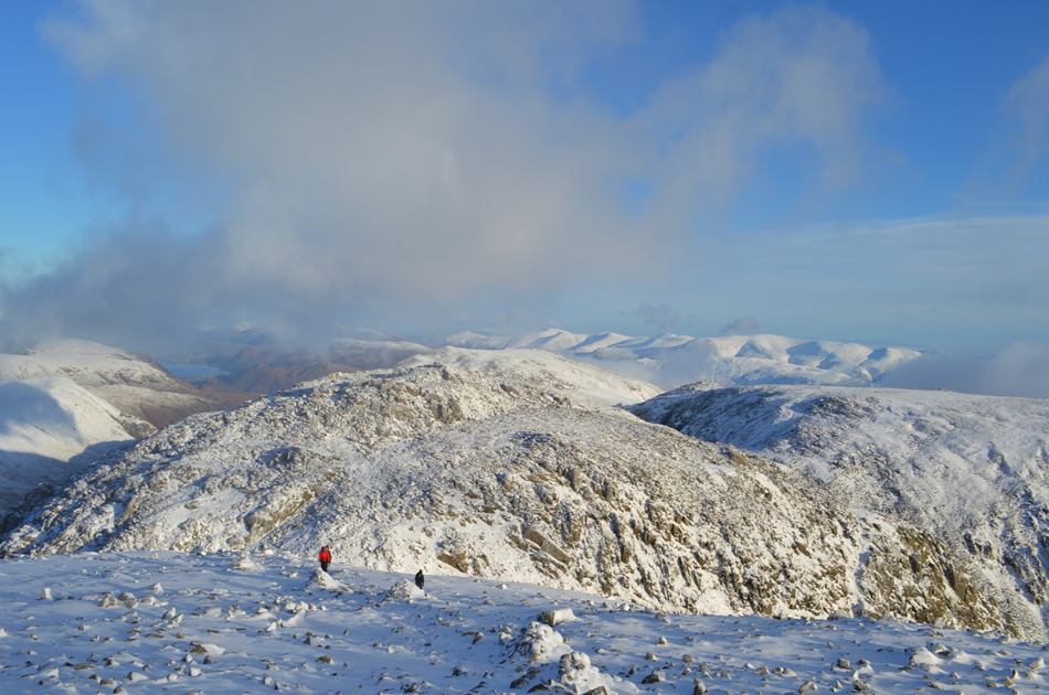 The elements were again upon me but the view and indeed the spindrift more than made up for this. Although it didn't take too long to reach the descent between III Crag and Broad Crag it was made to feel longer by how harsh conditions felt. I look back and spot the trio of walkers, the strongest of whom is wearing a red jacket who at times catches up to within a whisker of me only to stop to allow his friends to catch up.