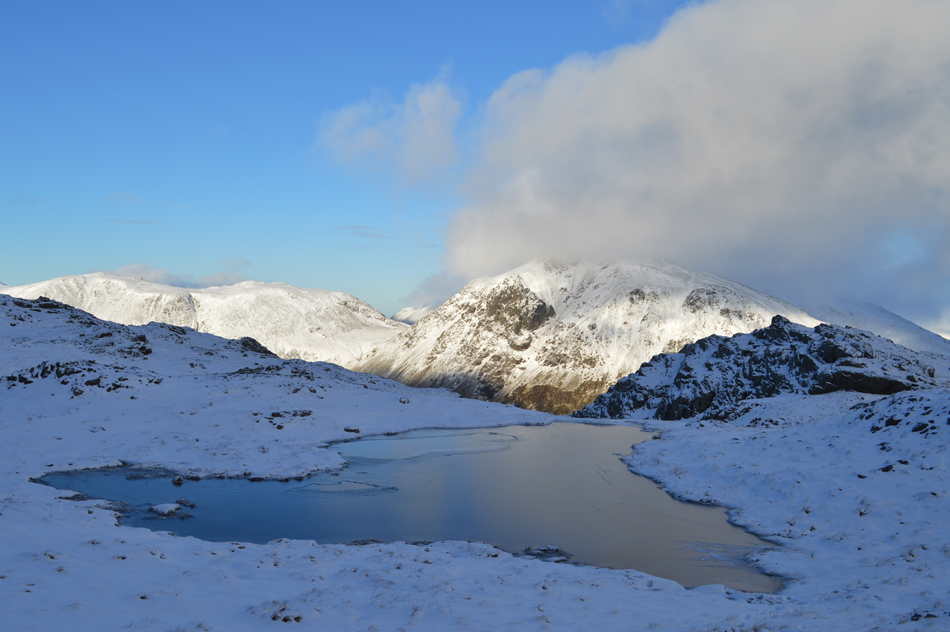 Great Gable, Kirk Fell and the top of Crisclife Knotts from a un-named frozen tarn on the Corridor Route. |