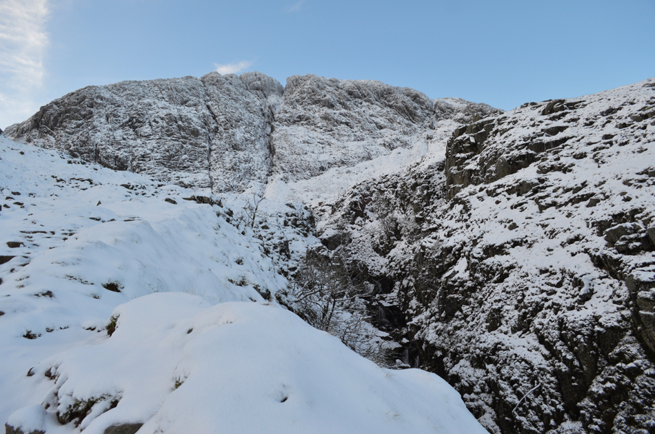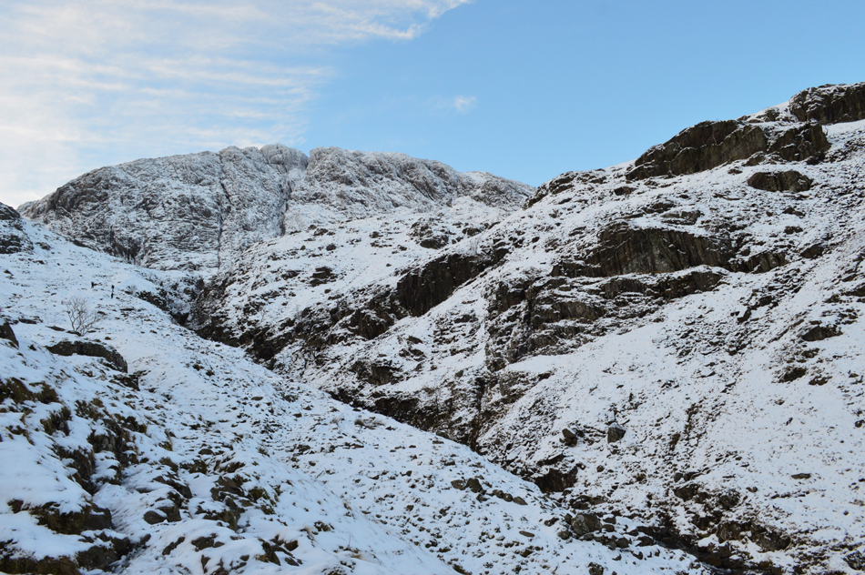 Allen Crags from the ravine at the top of Ruddy Gill. |