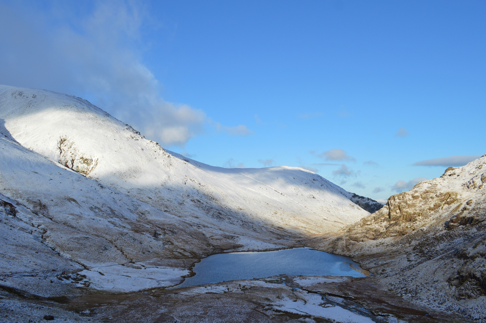 I continued to follow the fresh wet boot prints which confirmed who ever I was following was way up ahead (is it just me who is fascinated by who is ahead of you!) The path climbs steadily over frozen ground and up ahead I can see I'm about to reach the snow line. |