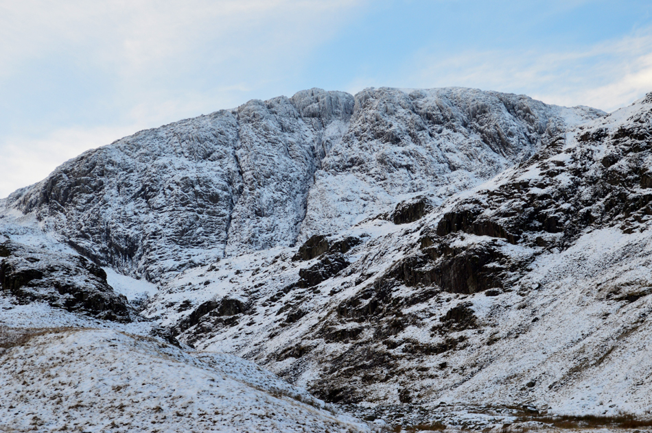 I had made the right decision in keeping the crampons encountering more ice along vast sections of the route making the traverse quite tricky had I not been wearing the crampons. The familiar scramble below Lambfoot Dub (Great End) was trickier than I thought and I took time to reckie my ascent and in the end I decided to ascend where a marker arrow had been painted onto the rock. |