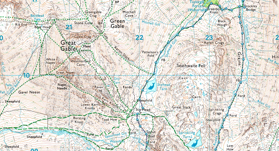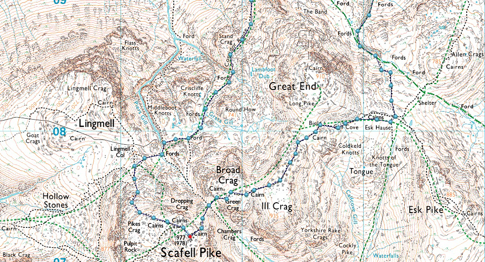 Seathwaite - Grains Gill - Ruddy Gill - Esk Hause - Calf Cove - Broad Crag Col - Scafell Pike - Lingmell Col - Top of Piers Gill - Corridor Route - Sty Head - Styhead Tarn - Styhead Gill - Seathwaite |