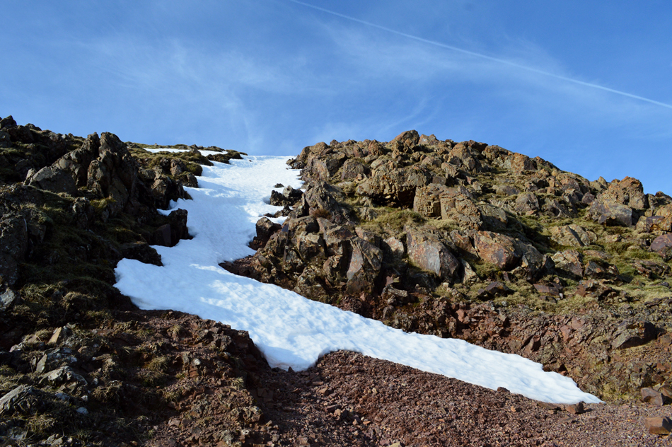 More snow was encountered just below the summit most of which was easily avoidable with the exception of this patch directly below the summit, we avoided it by using alternative path just left of the main approach path, both of which were quite eroded. |