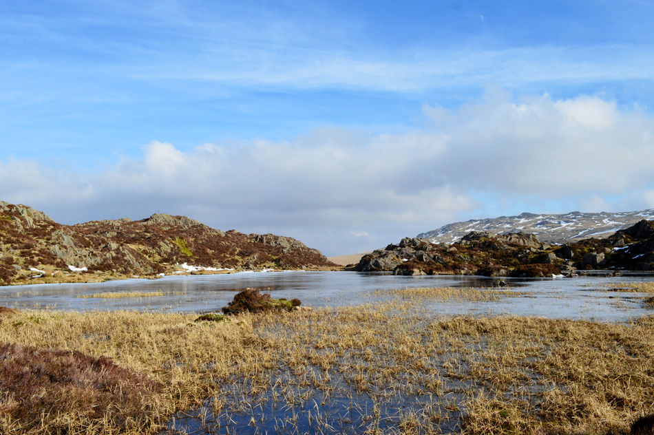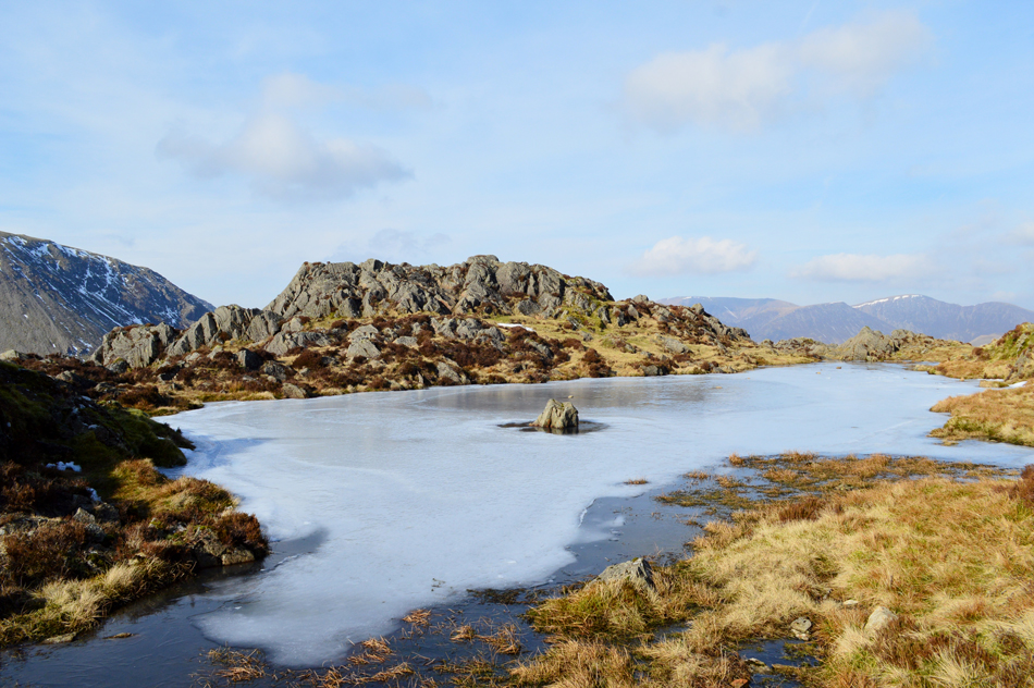 We traced around the western edge of Innominate Tarn finding the ground underfoot frozen and relative easy going, we aimed to find shelter within the crags which did nothing to ease away the windchill, in the end we perched ourselves on a outcrop whilst the wind whistled above our heads, it wasn't perfect but our view more than made up for it. |