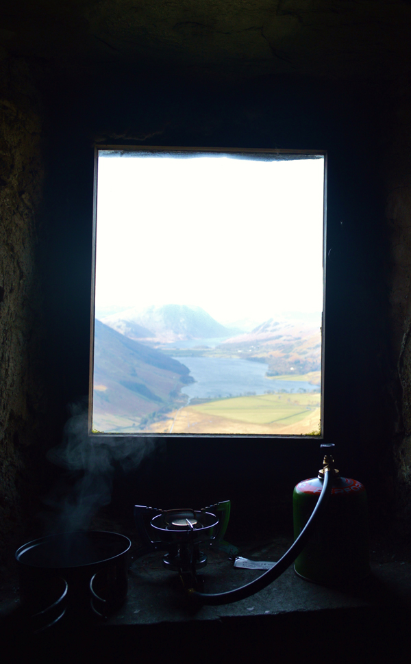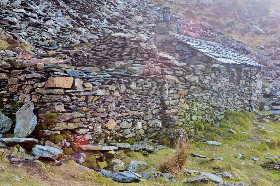 Ian wanted to see the new Chimney that had been installed after the previous one by all accounts, let the smoke back in. We heard voices coming from inside but went in anyway finding two young lads along with a Labrador. They were chatty and we shared a laugh later finding out that they had both forgotten thier maps meaning their oringinal route from Wasdale Head (I think) had to be shelvled in favour of a simpler route from Honister Slate Mine, they admitted they now found themsleves with a lot more time to kill than they had planned for. |