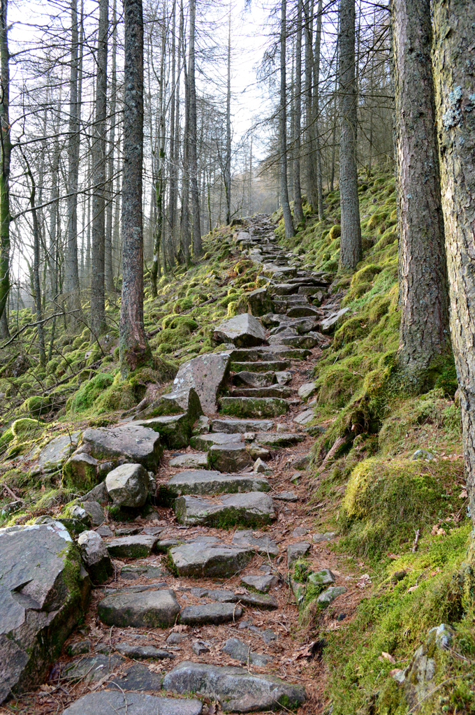 It's just a short stroll from the shoreline to the path which ascends to Bleaberry Tarn, it's pretty steep but of great pitch and before long views start to open out over the tops of the pines. |