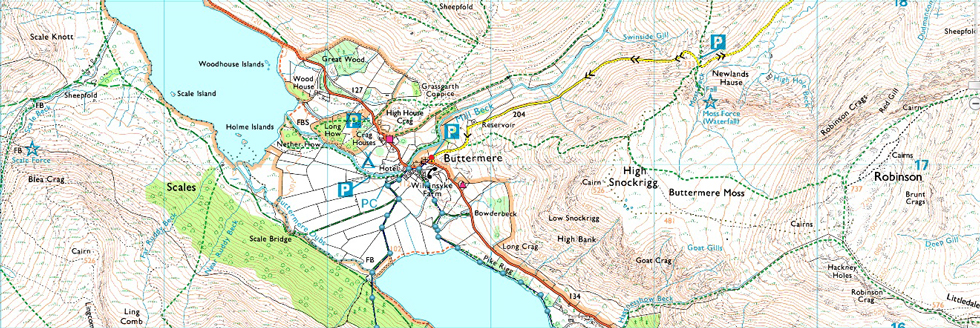 Buttermere is a fairly small village and due to this finding a place to park can be difficult especially during the Summer months. There is free off road parking at the end of the Newlands Pass (right arrow) where there is room for around a dozen cars but being a popular area these spaces fill up quickly, parking here is free. The Fish Inn and The Bridge Hotel also have small car parks which are for patrons only. During busier months Syke Farm Campsite allows parking for non patrons but charges apply. |