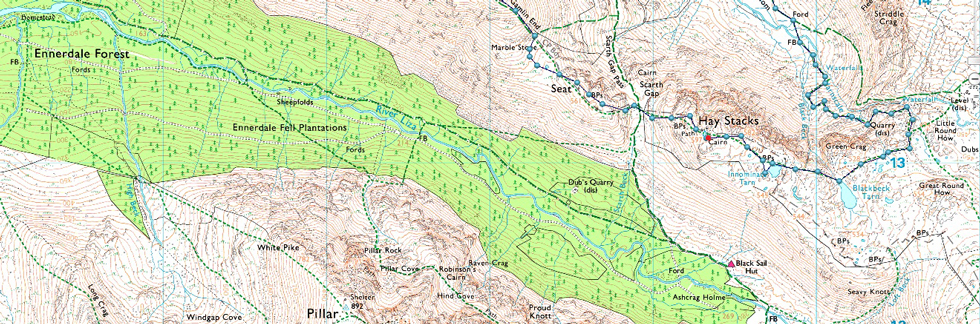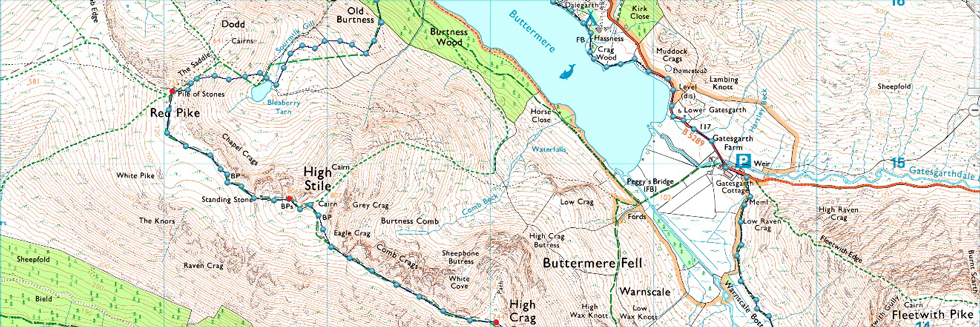 Buttermere – Old Burtness – Bleaberry Tarn – Red Pike (Buttermere) – High Stile – High Crag – Gamlin End – Seat – Top of Scarth Gap – Haystacks – Blackbeck Tarn – Warnscale Beck – Warnscale Bothy - Warnscale Bottom – Gatesgarth – Buttermere |