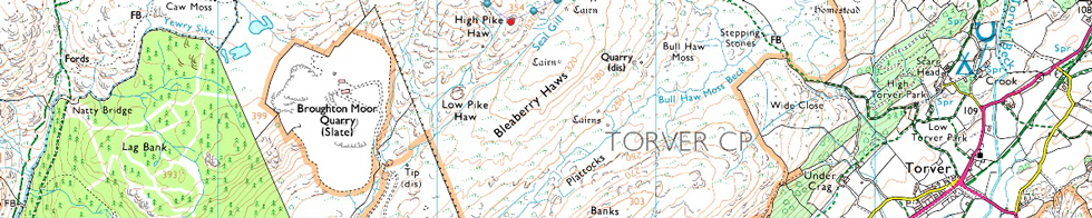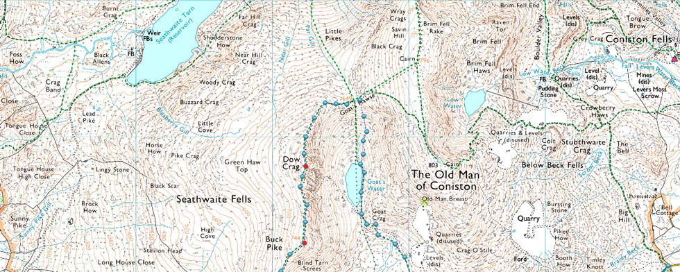 Fell Gate - Boo Tarn - The Cove - Goats Water - Goats Hawse - Dow Crag - Buck Pike - Brown Pike - Top of Walna Scar Road - Walna Scar - White Pike - White Maiden - High Pike Haw - Ash Gill - Torver Beck - Walna Scar Road - Fell Gate |