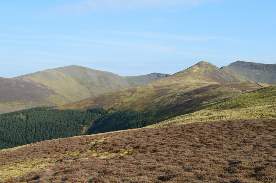 Here's Grisedale Pike north ridge seen over the tree lined Hobcarton valley with Ladyside Pike and Hopegill Head seen further right. |