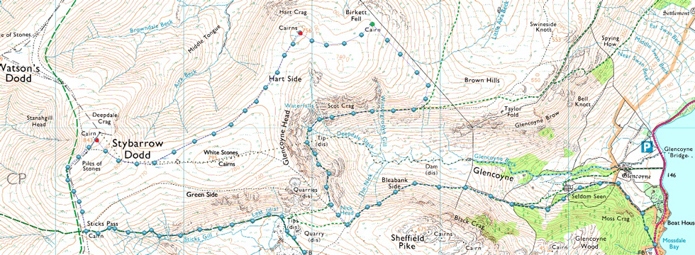 Stybarrow Crag – Glenridding – Greenside Mines – Top of Sticks Pass – Stybarrow Dodd – Hart Side – Birkett Fell – Glencoyne Traverse – Seldom Seen – Stybarrow Crag |