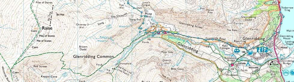We left the lake road behind, crossed the A592 and picked up Greenside Road. The road soon rises over the rooftops of Glenridding leaving extended views over the village towards a bustling campsite with Place Fell beyond. The Mires Beck route onto Birkhouse Moor is especially popular as is the queue at the Burger Van at the campsite below, no waft of bacon though, I suspect we're too far away. |