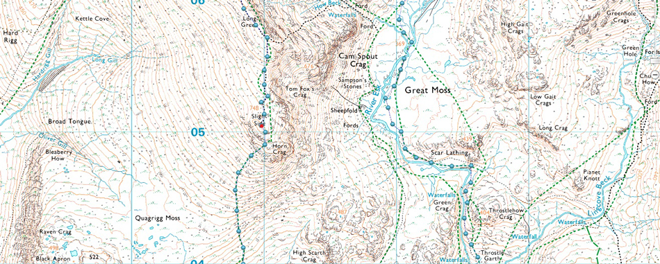 Jubilee Bridge - Brotherilkeld - Great Moss - Little Narrowcove - Pen - Eskdale Cairn - Rough Crag - Scafell Pike - Mickeldore - Rakes Progress - Lord's Rake - West Wall Tarverse - Deep Gill - Symonds Knott - Scafell - Long Green - Slight Side - Top of Cat Gill - Taw House Farm - Brotherilkeld - Jubiliee Bridge |