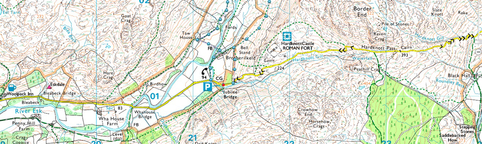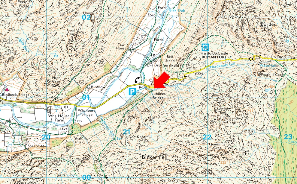 There is room for around eight well parked cars at Jubilee Bridge with further off road spaces found between Jubilee Bridge and Whahouse Bridge. The parking spaces are perfectly positioned to get into upper and lower Eskdale whether you aim for a walk up Harter Fell, Bowfell or the Scafells these spaces during summer are at a premium and my advice is to arrive early should you want to secure a parking place. Look out for the cattle grid at the bottom of Hardknott Pass (Jubilee Bridge itself cannot be seen from the road) parking can be found on the left if approaching from the top of the Hardknott Pass or just after the cattle grid on the right if approaching from Eskdale. Parking is free. |