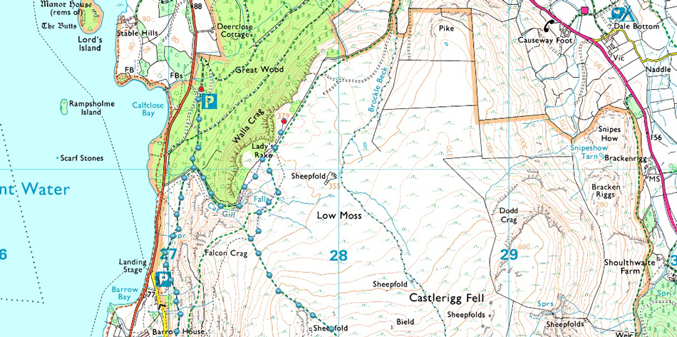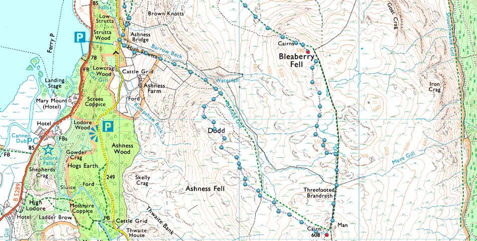 Great Wood - Cat Gill - Walla Crag - Top of Cat Gill - Bleaberry Fell - High Seat - Ashness Fell - Dodd - Ashness Bridge - Path below Falcon Crag - Great Wood |