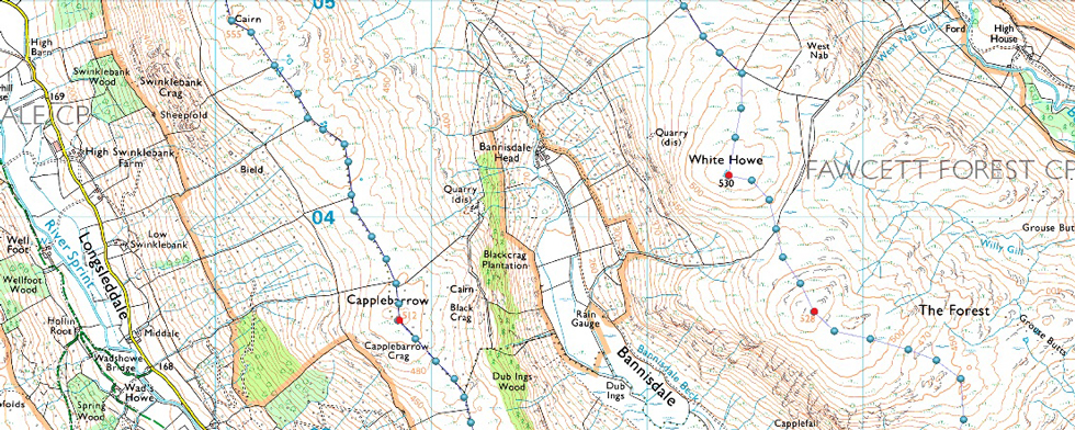 Dryhowe Bridge - Whiteside Pike - Todd Fell - Capplebarrow - Ancrow Brow - Borrowdale Moss - Long Crag (Bannisdale) - White Howe - Borrowdale Head - Lamb Pasture - Dryhowe Bridge |
