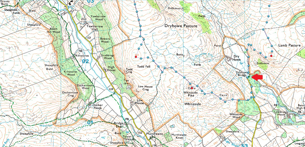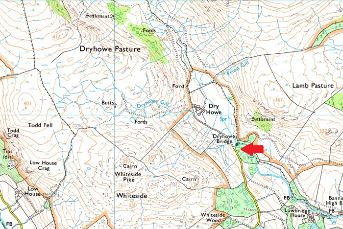 Parking at Dryhowe Bridge is limited to just two, possibly three well parked cars. Further back up the lane before the top of the brow is reached there is a grass lay by with space for two vehicles. My advice is to arrive early to avoid disappointment. Parking is free. |
