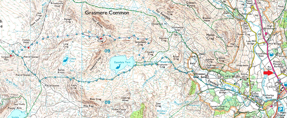 A591 - Grasmere - Easedale Road - Goody Bridge - Sourmilk Gill - Tarn Crag East Ridge - Tarn Crag - Codale Head - Easedale Tarn - Sourmilk Gill - Easedale Road - Grasmere - A591 |
