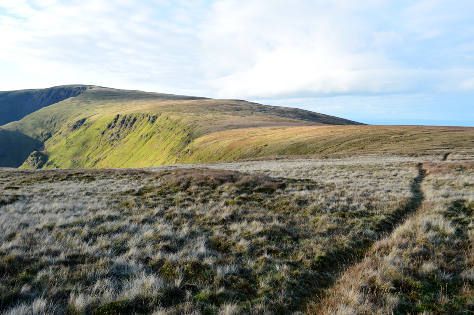 After ascending the grassy track I arrived at the shoulder of White Hall Knott with the continued ascent of White Combe directly in front of me, here I head left over what appeared to be a grassy ledge like path towards the summit where I was presented with the grandest of views of Black Combe and Blackcombe Screes. |
