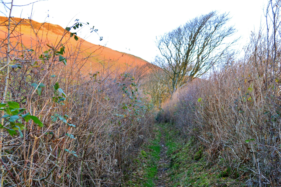 The narrow hedge lined track which leads towards the lower slopes of White Hall Knott. |
