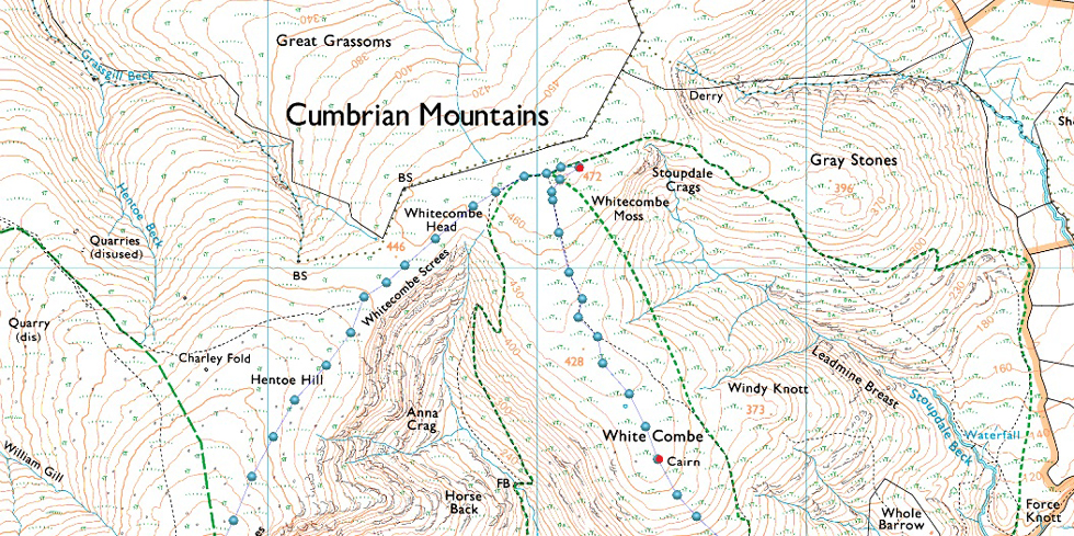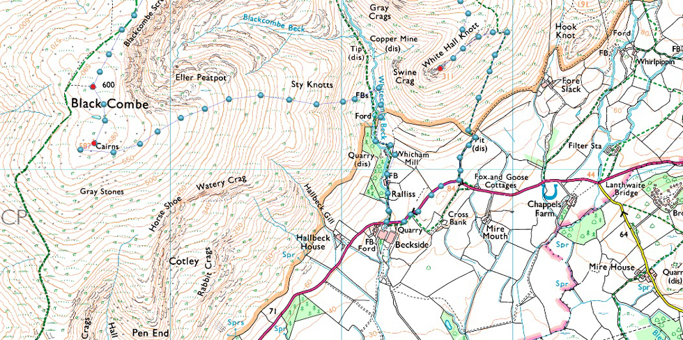 Beckside - White Hall Knott - White Combe - Stoupdale Head - Whitecombe Screes - Blackcombe Screes - Hentoe Hill - Black Combe - Black Combe South Top - Sty Knotts - Whitecombe Beck - Beckside |