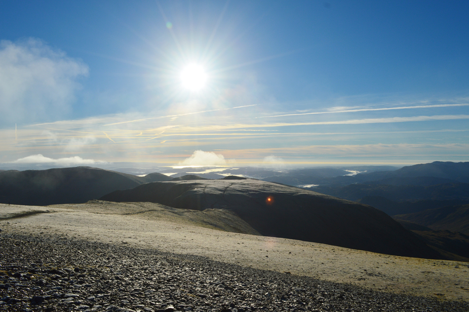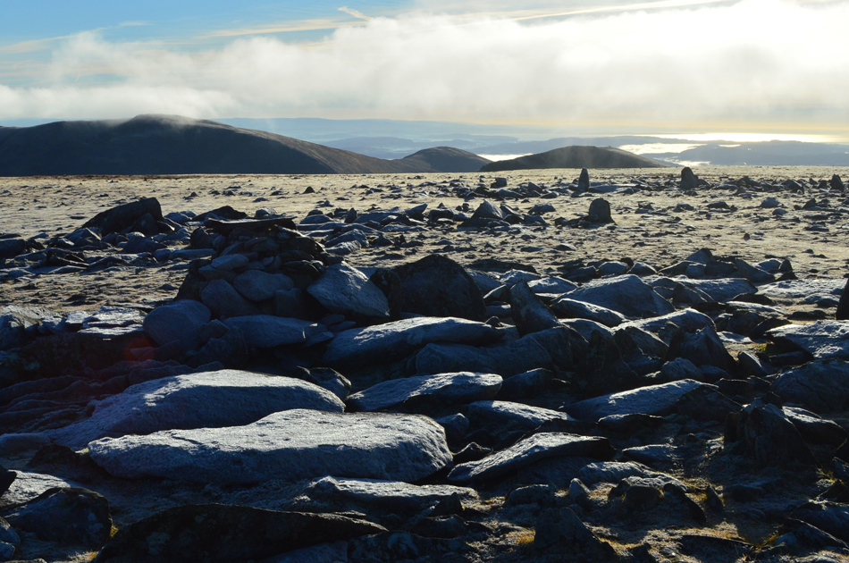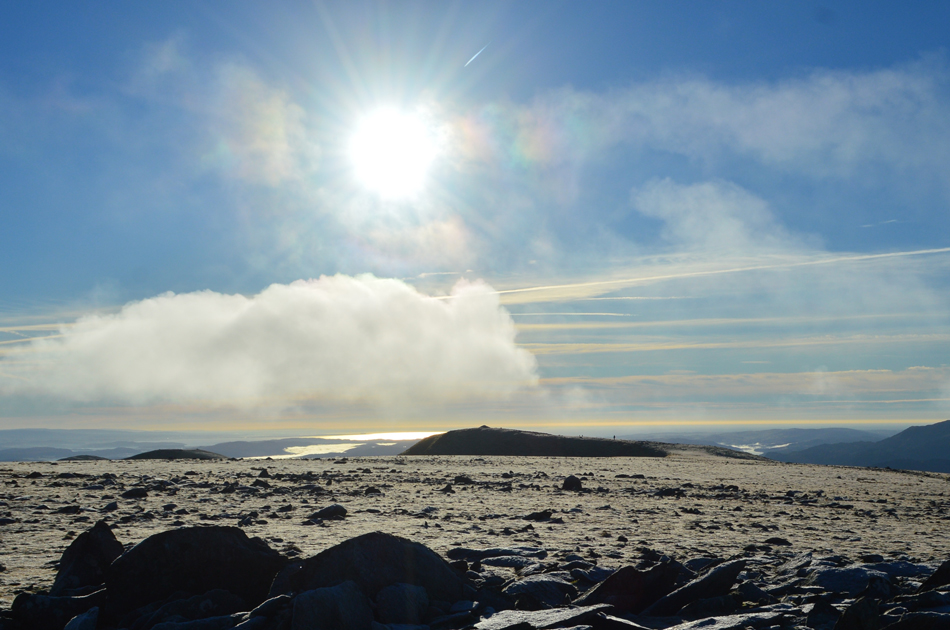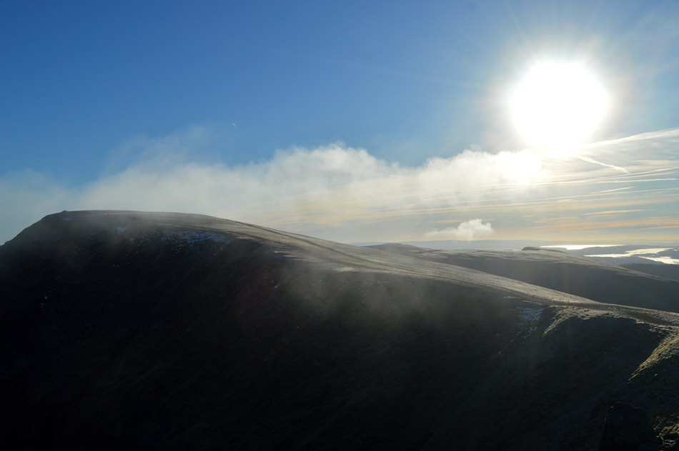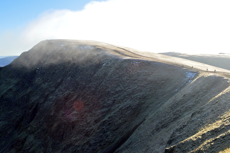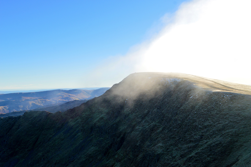 With a strong sun to the south we crested Lower Man in time to witness a small bank of cloud passing over Helvellyn summit. |