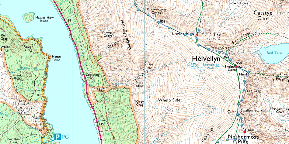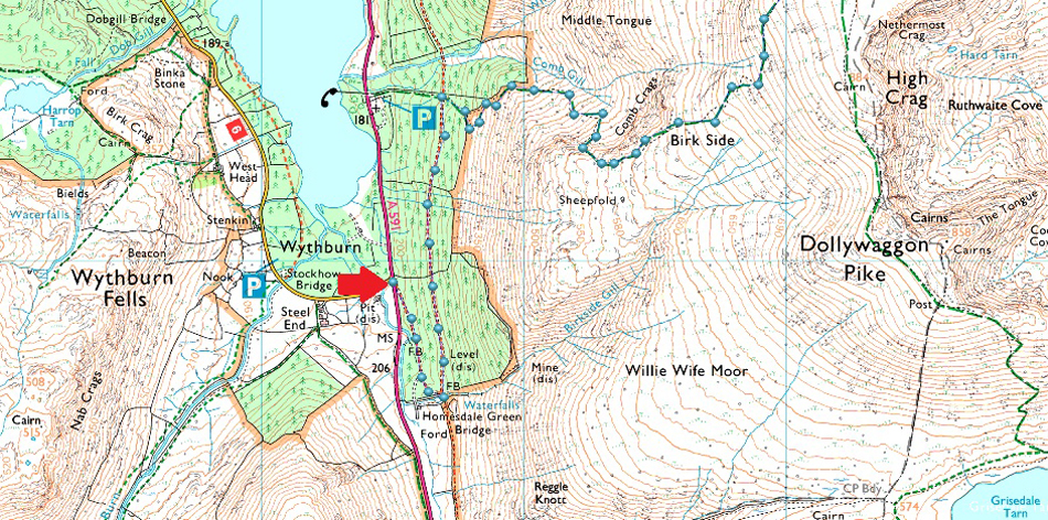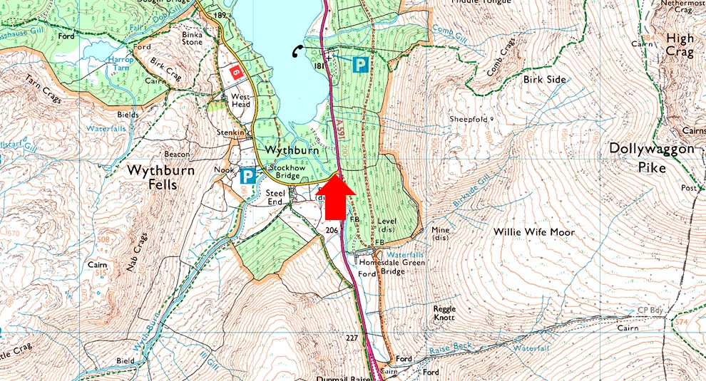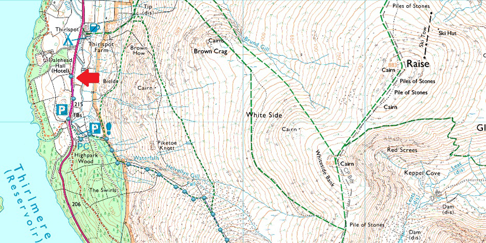 The car park at Swirls is a very popular car park all year around and is owned by United Utilities. There is a toilet block on the car park with easy access onto Helvellyn via Browncove Crags. On the opposite side of the A591 a smaller car park can be found overlooking Thirlmere Reservoir. Parking charges apply at both car parks, however a short distance north (upper arrow) a lay-by can be found where it is free to park. |