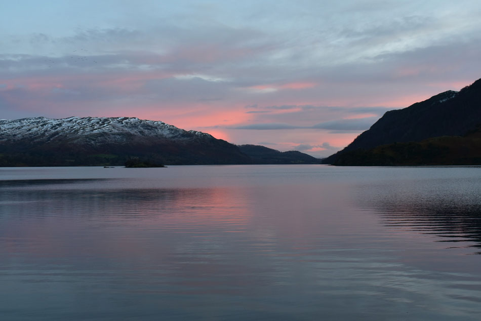 Snow had fallen at all levels during the week and although most was confined to the higher slopes I didn't want to take any chances by driving over the Kirkstone Pass so instead I approached Glenridding from the north which worked out well because I wouldn't have been able to take this picture of a glowing sunrise behind Gowbarrow fell taken from the parking spaces at Stybarrow Crag. |
