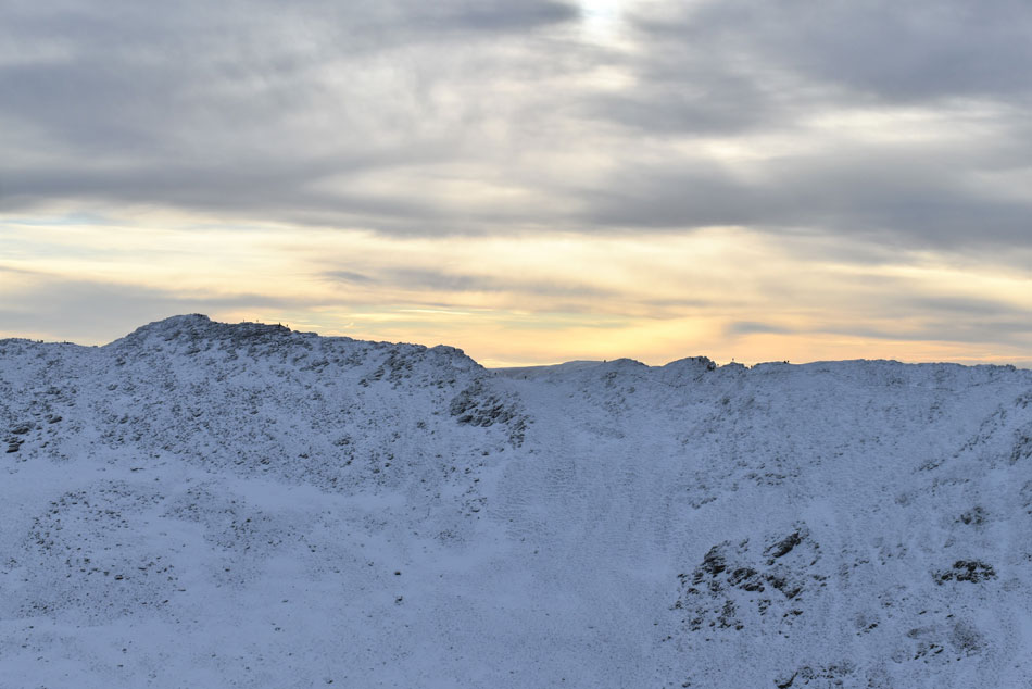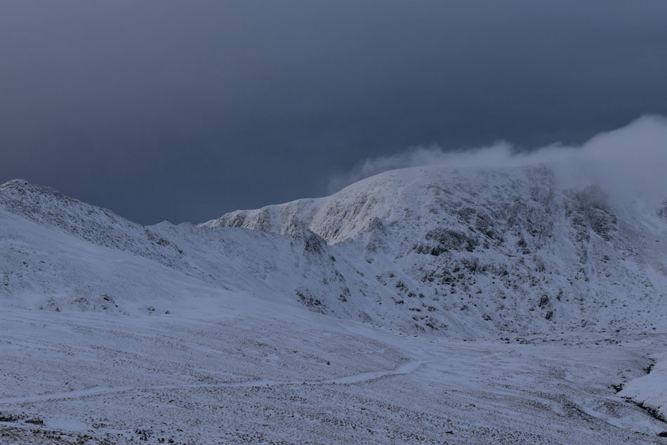 I entered the snow line higher than expected at approximately 1,800ft just prior to reaching the stone wall on Birkhouse Moor. Sections of the path below were starting to freeze and care had to be taken because much of the ice was glazed over rock. I climbed alongside the stone wall before breaking away northwards where the depth of the snow varied between 3 inches and drifted up to 2ft in depth. The last part of this northward facing path is always thrilling because the incline lessens and this magical view of Helvellyn is just minutes away. |