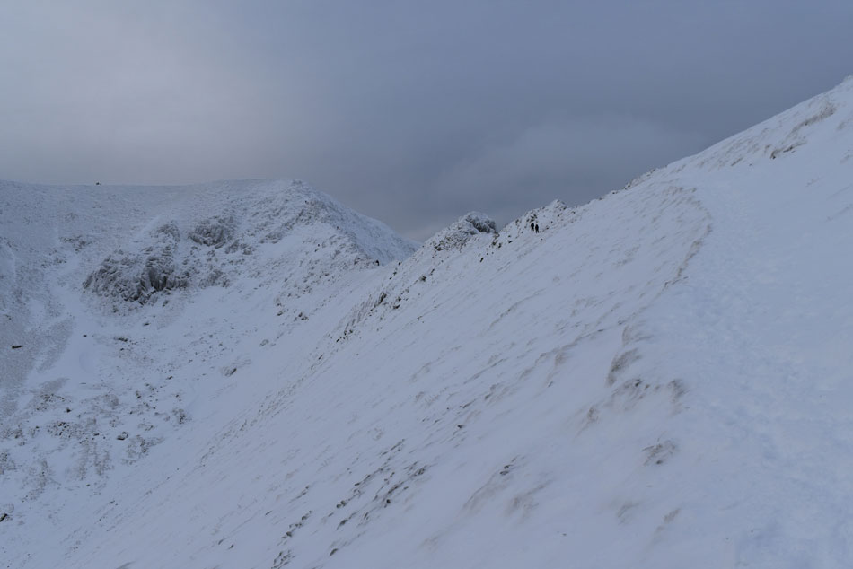 I made the short ascent up to Hole-in-the-Wall just to take in the view over Grisedale valley but found cloud lingering over St Sunday Crag which stretched out as far as Dollywagon Pike and thinned over Nevermost Pike and Helvellyn, I guess I could count my chickens Helvellyn wasn't in the cloud. Leaving Hole-in-the-Wall and its steady stream of walkers Striding Edge bound I descended back towards the Red Tarn path encountering deep drift before arriving at the footpath bound for Red Tarn.