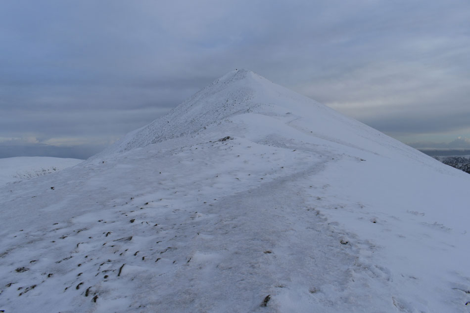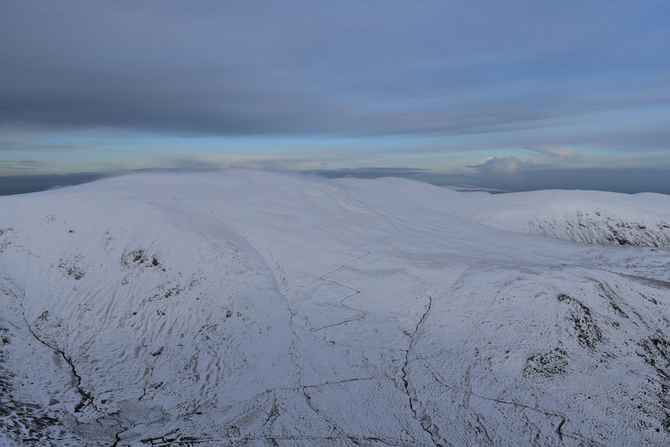 A couple had arrived just as I was ready to leave and after a quick 'Hi' I left and started my descent down the north east ridge. The snow was by now as deep as I had encountered but I was lucky enough to be able to follow the same footprints that the two walkers had left earlier which were made to measure! |