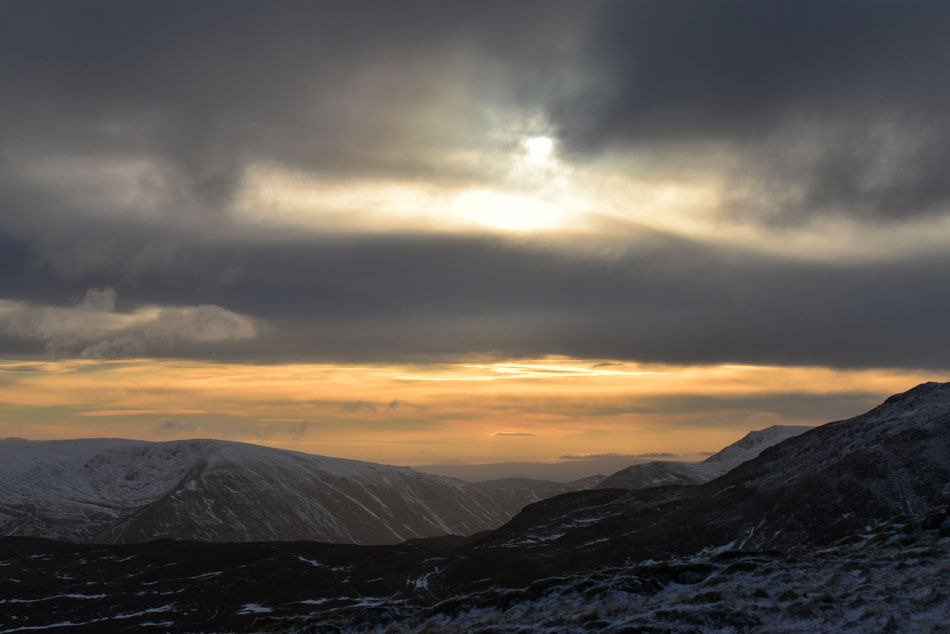 It may be cloudy but the low cloud is trapping sunlight leaving a golden afterglow between the fell tops and the upper layer of cloud. Here I stop to look south beyond Birks towards St Sunday Crag and Caudale Moor. |